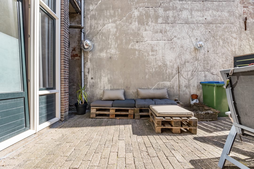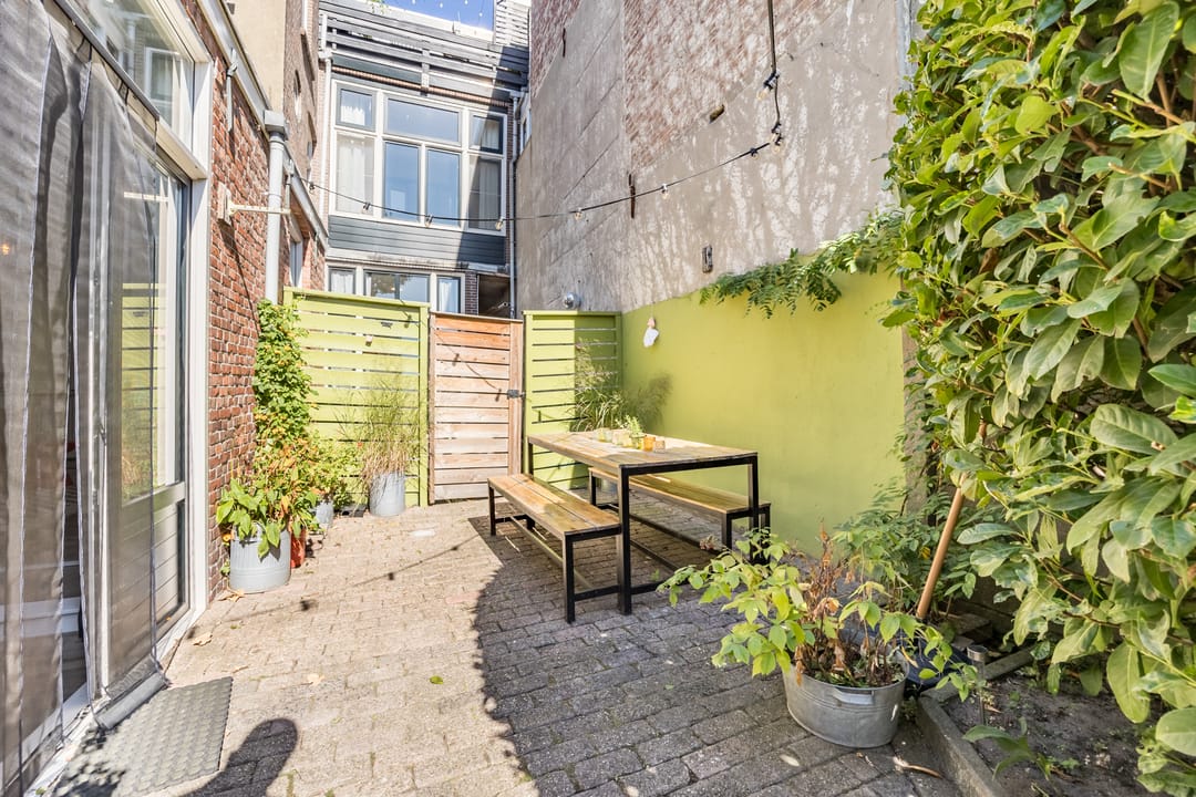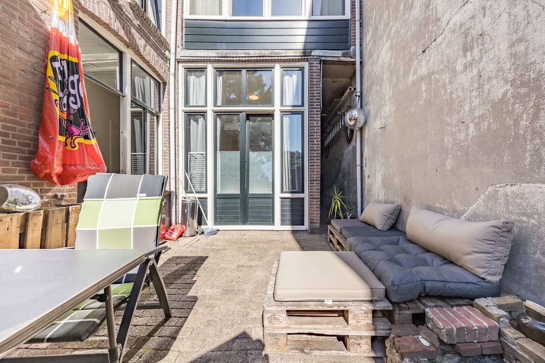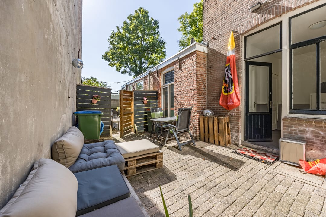 Entree met hal en toegang tot 2 ruime kamers, nette gezamenlijke keuken en toilet, meterkast, was- bergruimte en bijkeuken. Vanuit de bijkeuken is er toegang tot de royale achtertuin, een zeer riant verblijf met eigen keuken, toilet en douche en trapopgangen naar de kamer op de 1e verdieping en de kamer op de 2e verdieping. De royale achtertuin is tevens middels een eigen doorgang vanaf de straatzijde bereikbaar.