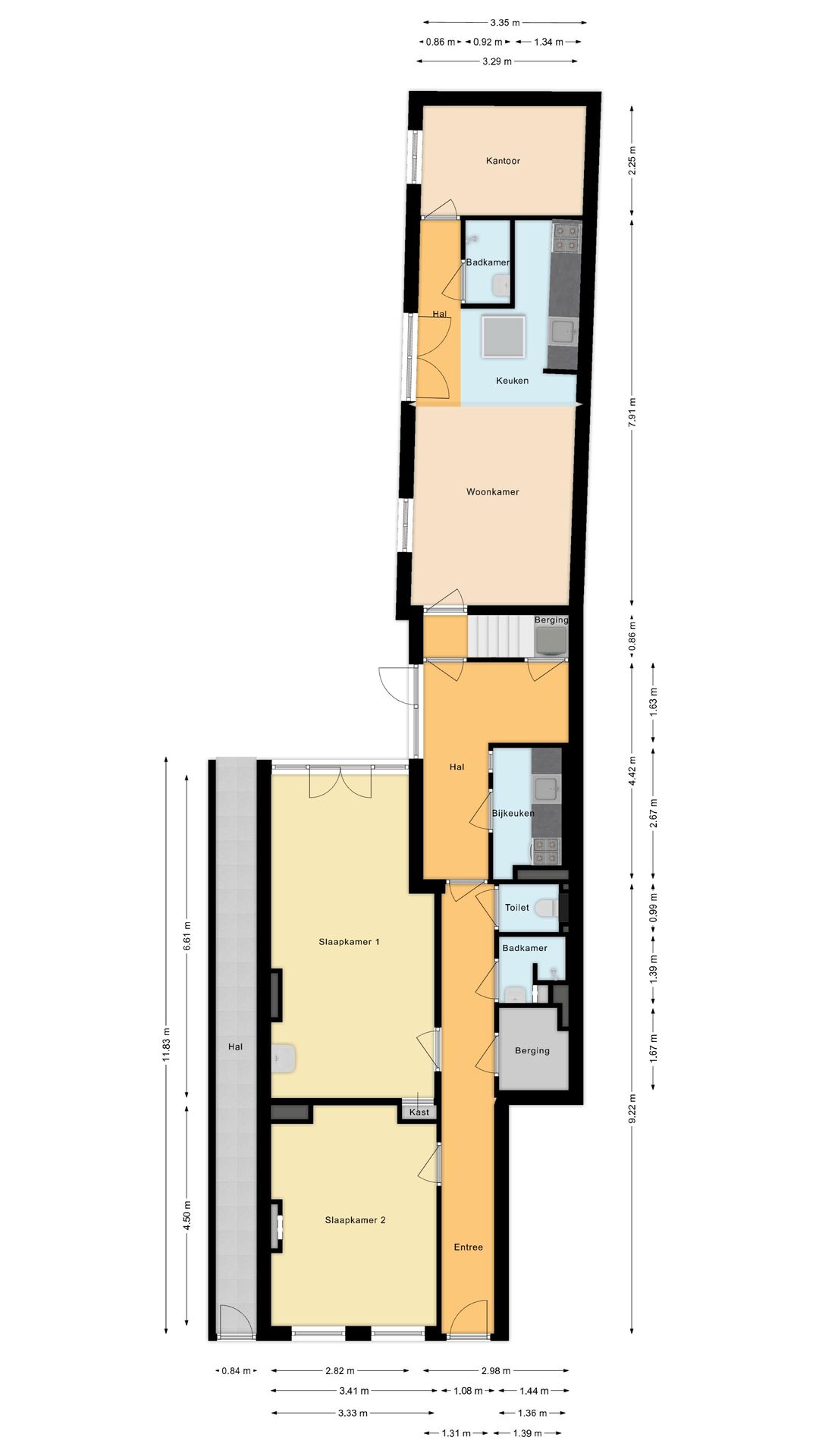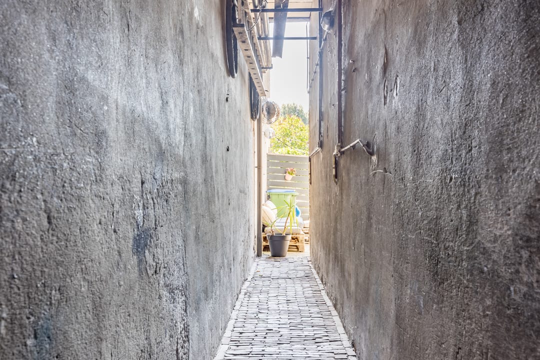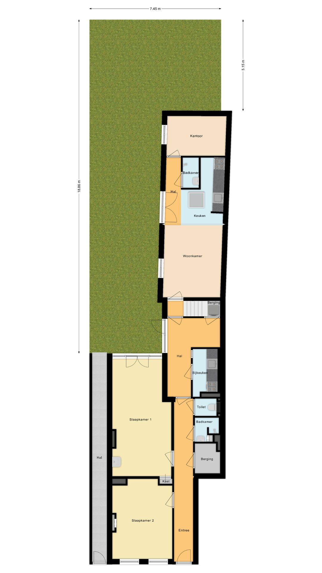 Entree met hal en toegang tot 2 ruime kamers, nette gezamenlijke keuken en toilet, meterkast, was- bergruimte en bijkeuken. Vanuit de bijkeuken is er toegang tot de royale achtertuin, een zeer riant verblijf met eigen keuken, toilet en douche en trapopgangen naar de kamer op de 1e verdieping en de kamer op de 2e verdieping. De royale achtertuin is tevens middels een eigen doorgang vanaf de straatzijde bereikbaar.