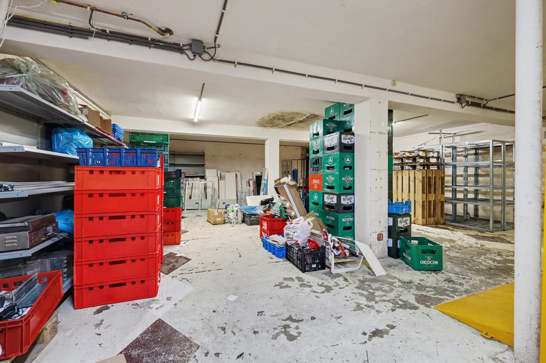 De kelderruimte wordt momenteel gebruikt als opslagruimte en biedt aanvullende functionele ruimte ten behoeve van de exploitatie van de commerciële ruimte. Door de geplaatste stapelaar-lift zijn ook zwaardere goederen te verplaatsen naar de kelder. Tevens bevindt zich in de kelder de koelinstallatie van de vriescel en de cv-installatie van het pand.