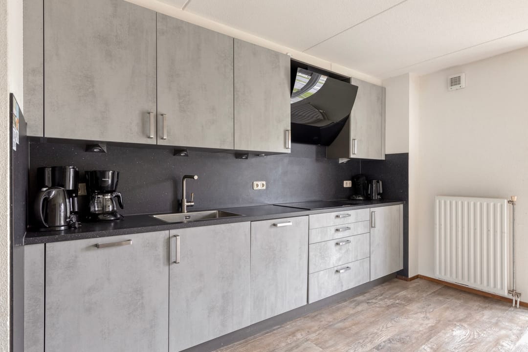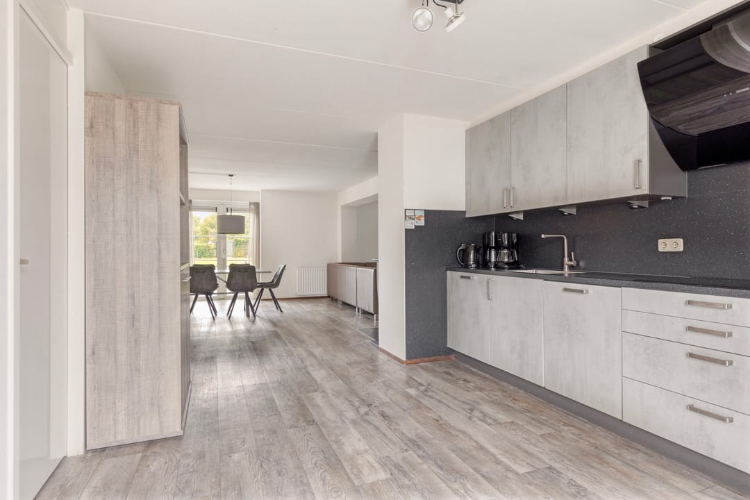 Via de entree met trapopgang naar de eerste verdieping en een separaat toilet met wastafel bereik je de ruime woonkamer. Deze loopt naadloos over in de eetkamer en open keuken, die is uitgerust met moderne inbouwapparatuur.