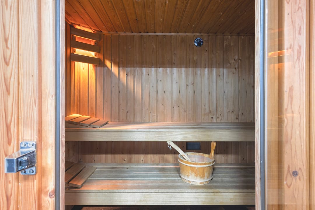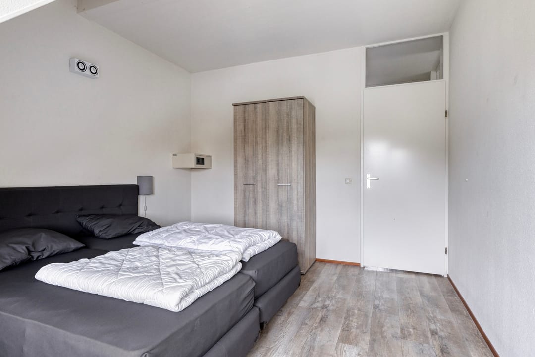 Vanuit de woonkamer zijn twee slaapkamers bereikbaar, waarvan één met tuindeuren naar de tuin. Verder is er een badkamer met dubbele wastafel, douche en toilet en een aangrenzende sauna. Via een tweede hal is er eveneens toegang tot de tuin, gelegen nabij de aangebouwde garage. Deze garage is bereikbaar via de garagedeur en beschikt over een achterdeur naar de tuin.