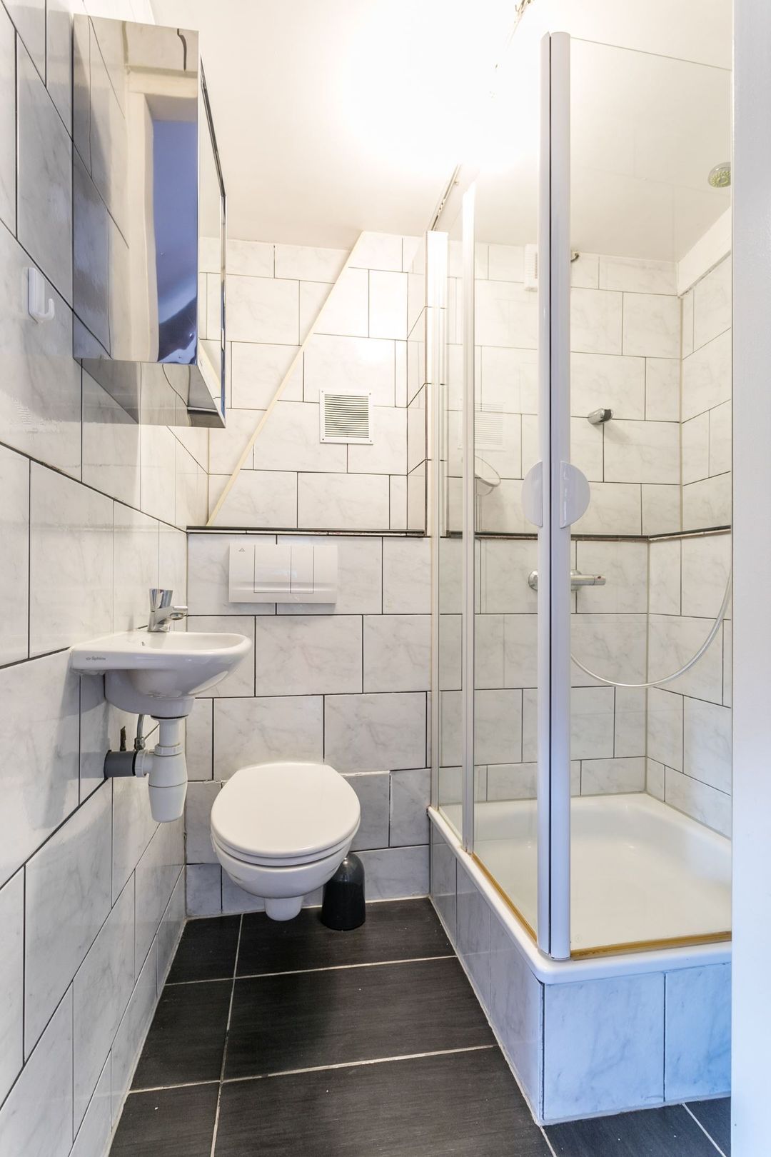 De geheel betegelde badkamer is voorzien van een douche, vaste wastafel en toilet.