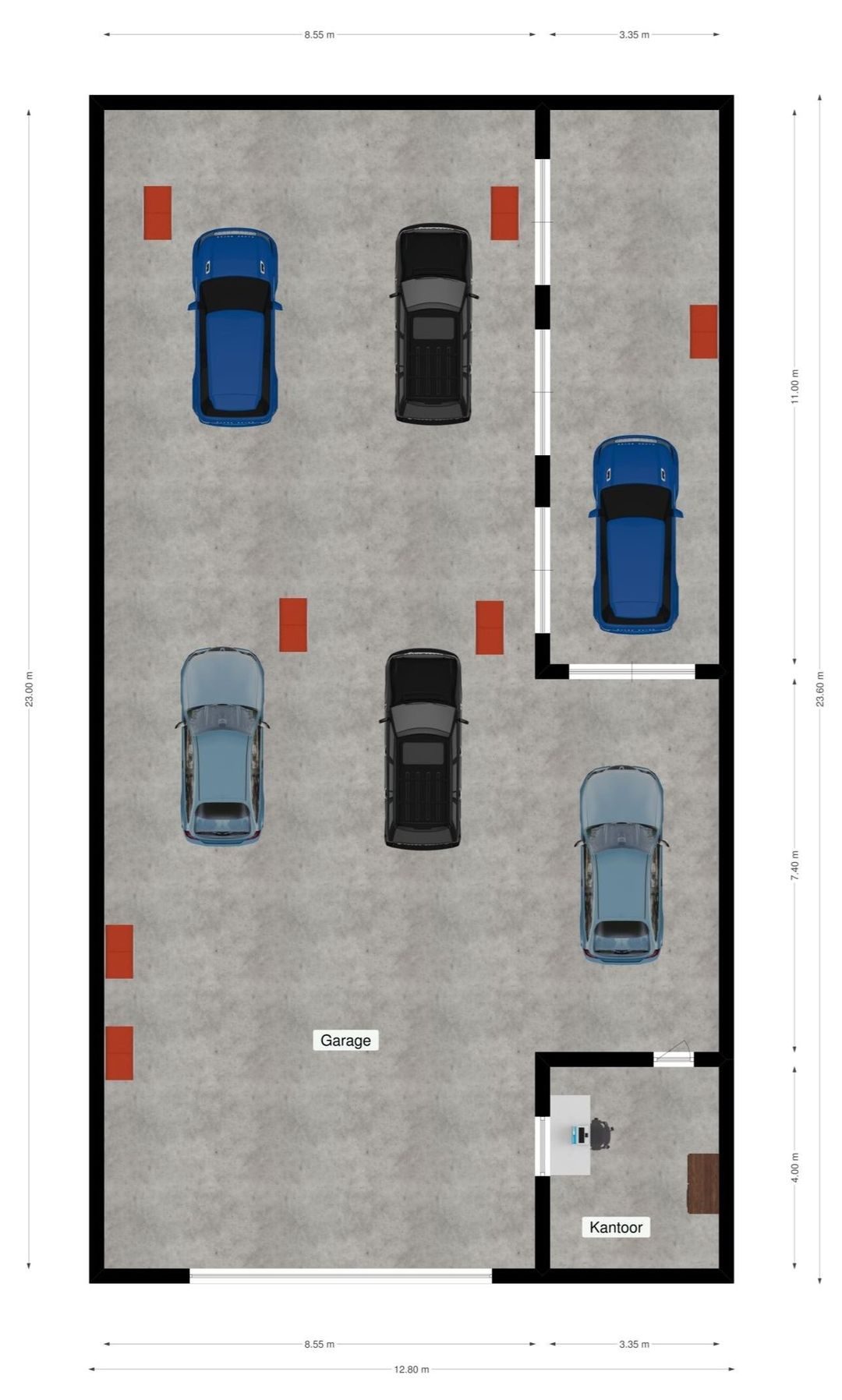 De totale oppervlakte van de garage en kantoor is ca. 275 m².