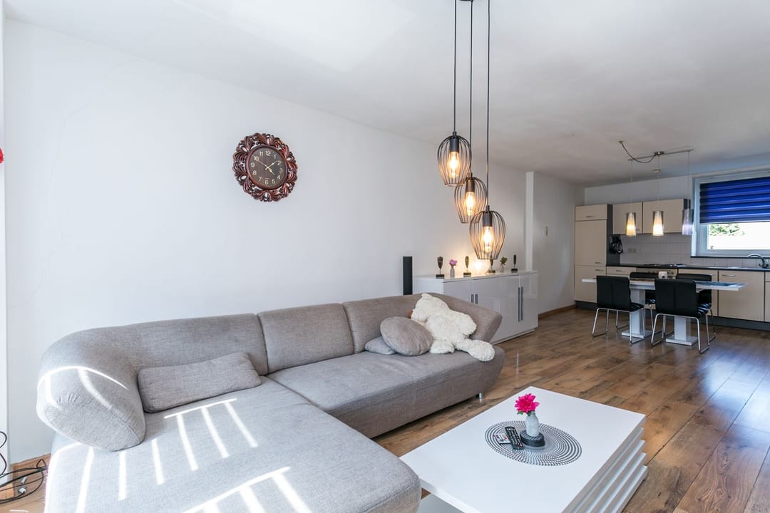 De ruime woonkamer ca. 30 m² met laminaatvloer is voorzien van een open keuken.