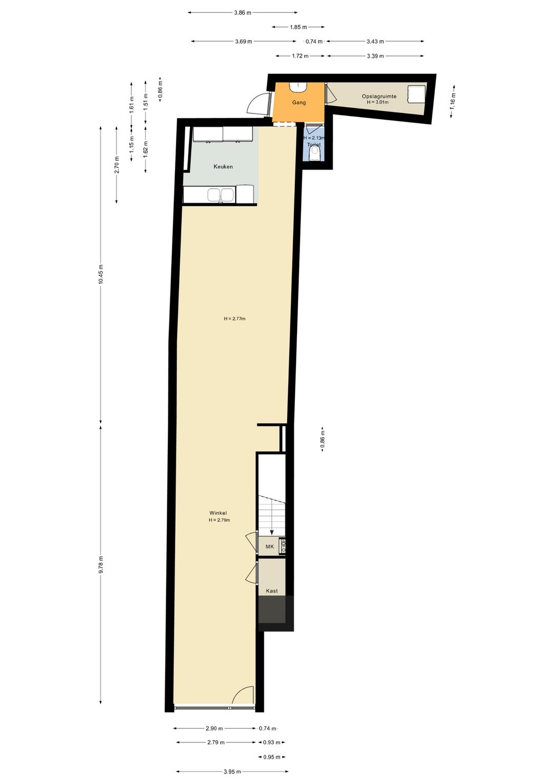 Begane grond: entree, winkelruimte, kast/berging (garderobe), meterkast, keuken, hal/gang, toilet, opslagruimte, patio.