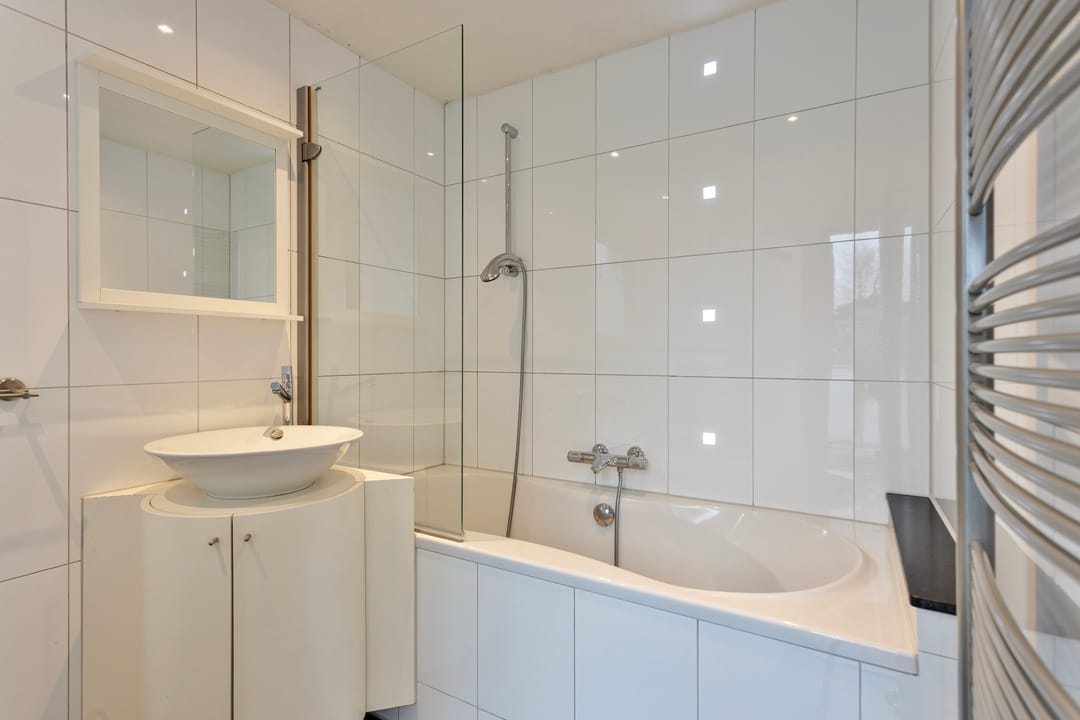- ca. 114 m2. Eigen entree, meterkast en trap naar 1e verdieping. Overloop en toegang naar ruime woonkamer aan de voorzijde met parketvloer. Dichte ruime keuken met diverse apparatuur zoals een oven, koelkast, magnetron, 5 pits gaskooplaat en vaatwasser. Toegang vanuit de keuken naar 2 terassen gelegen op het oosten. Slaapkamer met rolluik en parketvloer. Badkamer is gelegen achter de keuken met ligbad, toilet, designradiator en vaste wastafel, geheel betegeld. 2e verdieping: 2 slaapkamers met laminaat vloer en airco unit. Extra berging voor de was machine / droger.