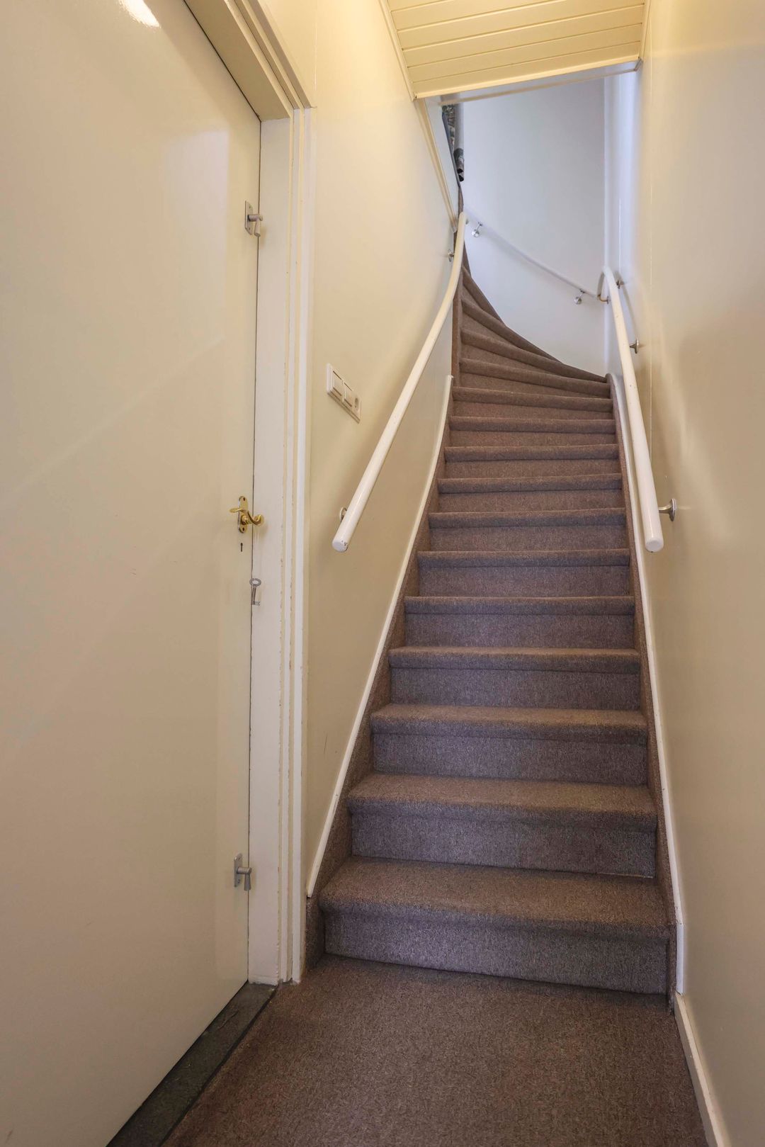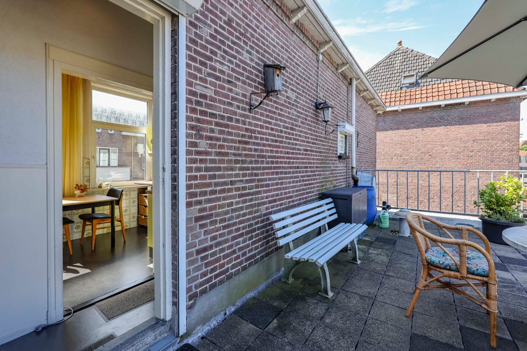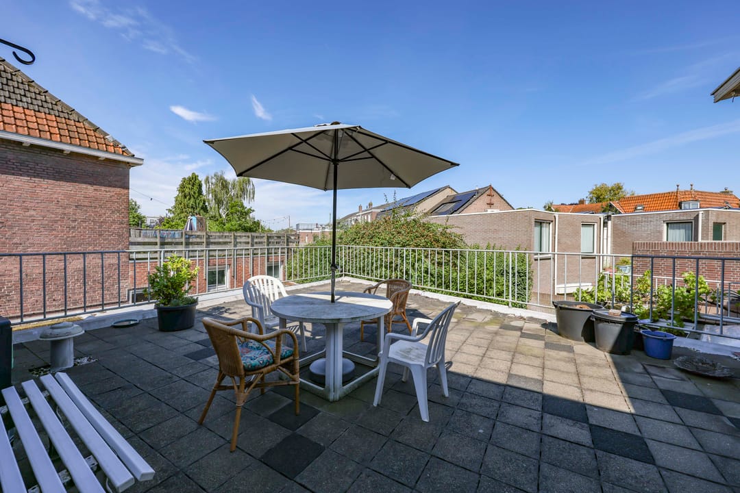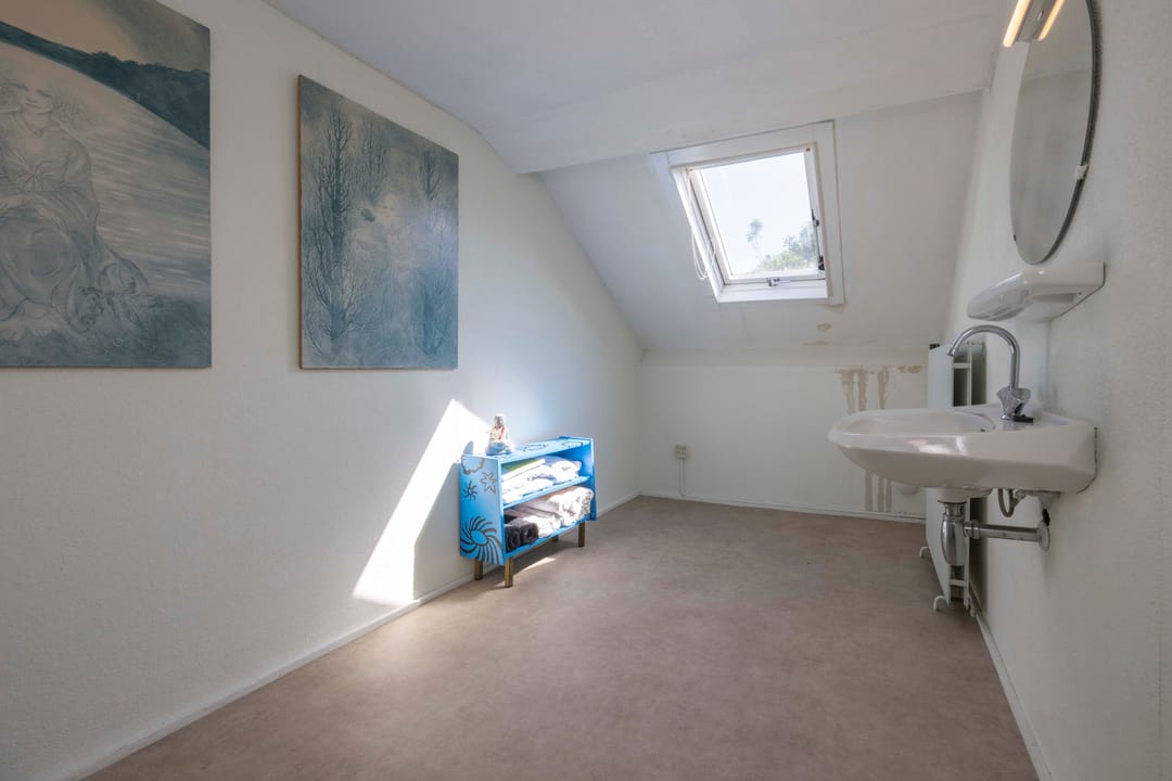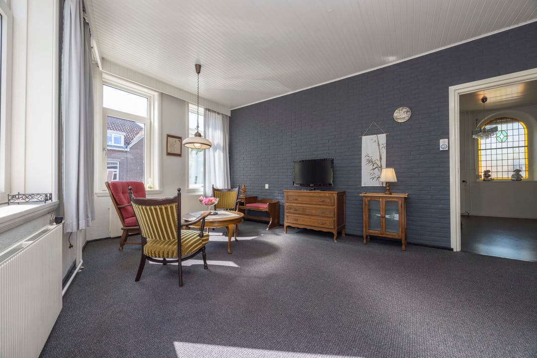 Rechts van de winkelruimte de entree naar de bovenwoning. Op de eerste verdieping een ruime overloop naar woonkamer, keuken en twee slaapkamers. In de keuken een eenvoudige inbouwkeuken voorzien van een gaskookplaat en een afzuigkap. Ouderslaapkamer met aansluitend een badkamer met ligbad en wastafelmeubel. Verder op de overloop een toilet, een loopdeur naar het dakterras, een vaste kast en de trapopgang naar de tweede verdieping. Vaste trap naar voorzolder. De voorzolder biedt toegang tot een derde slaapkamer met wastafel en een grote open zolder. Er is op de tweede verdieping nog voldoende ruimte voor het creëren een vierde slaapkamer. Aan de achterzijde van de bovenwoning een royaal dakterras.