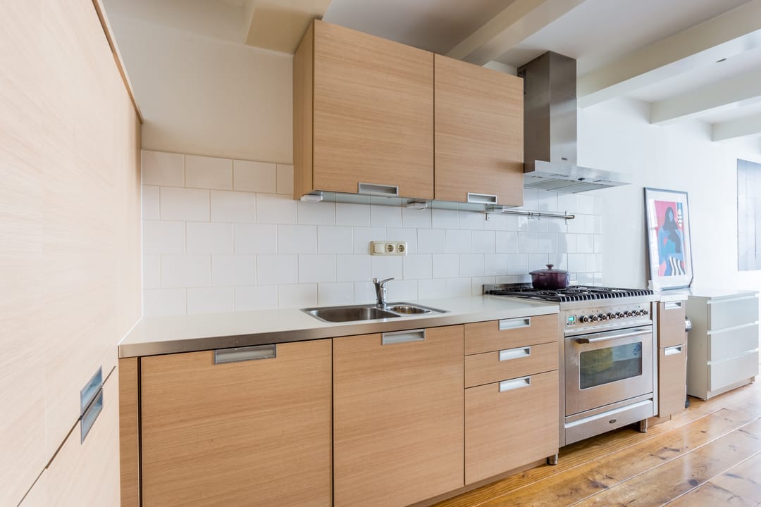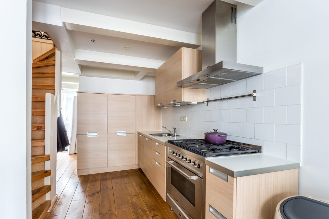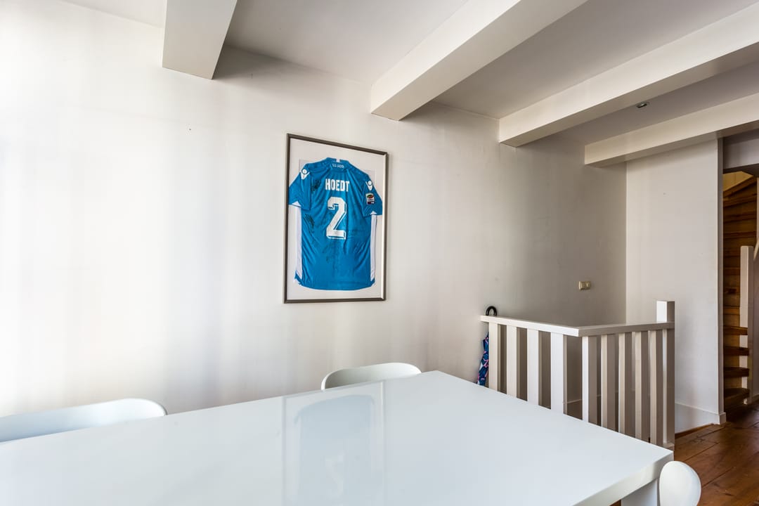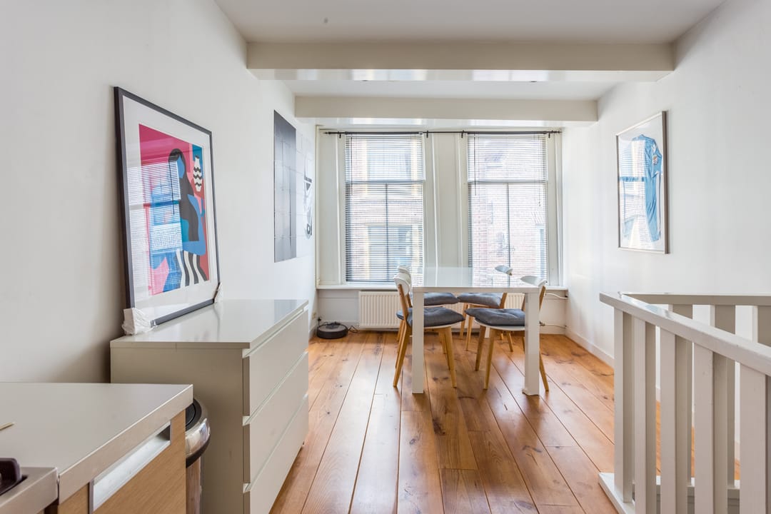 De vaste trap leidt naar de eerste verdieping waar zich de eetkamer en open keuken bevinden. De keuken is uitgerust met diverse inbouwapparatuur, waaronder een gasfornuis met oven, afzuigkap, koelkast en vaatwasser. Vanuit de hal is toegang tot de badkamer, voorzien van een toilet, wastafel, douchehoek en aansluitingen voor wasmachine en droger. Vanuit deze verdieping is tevens een klein, besloten dakterras bereikbaar.
