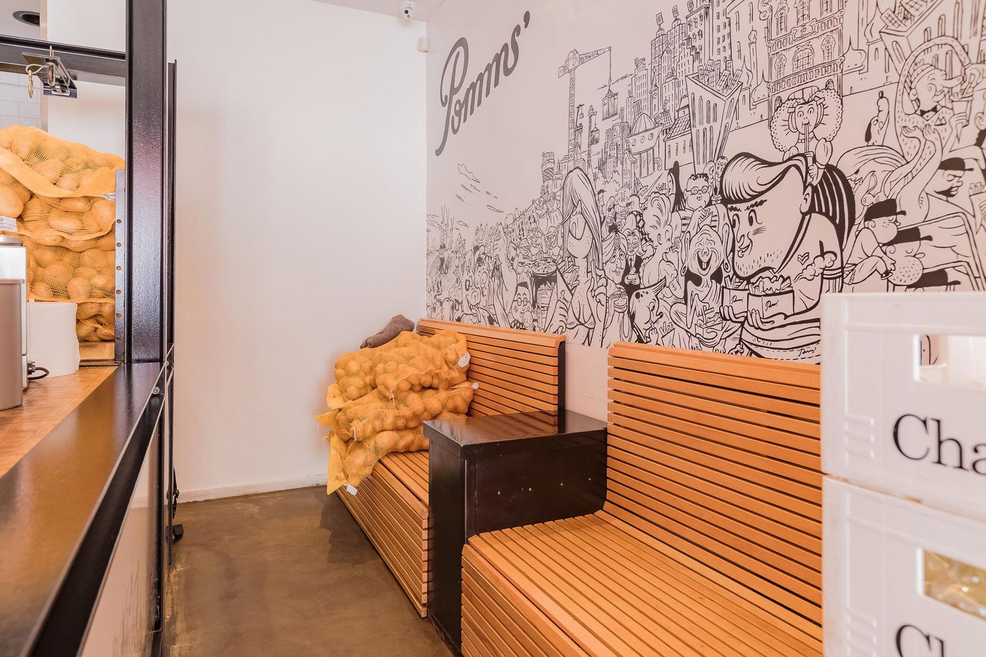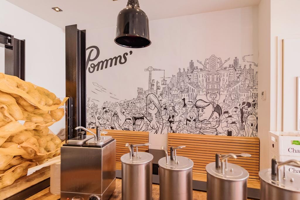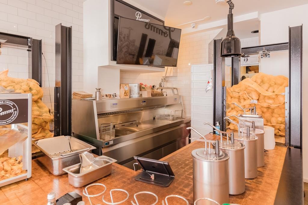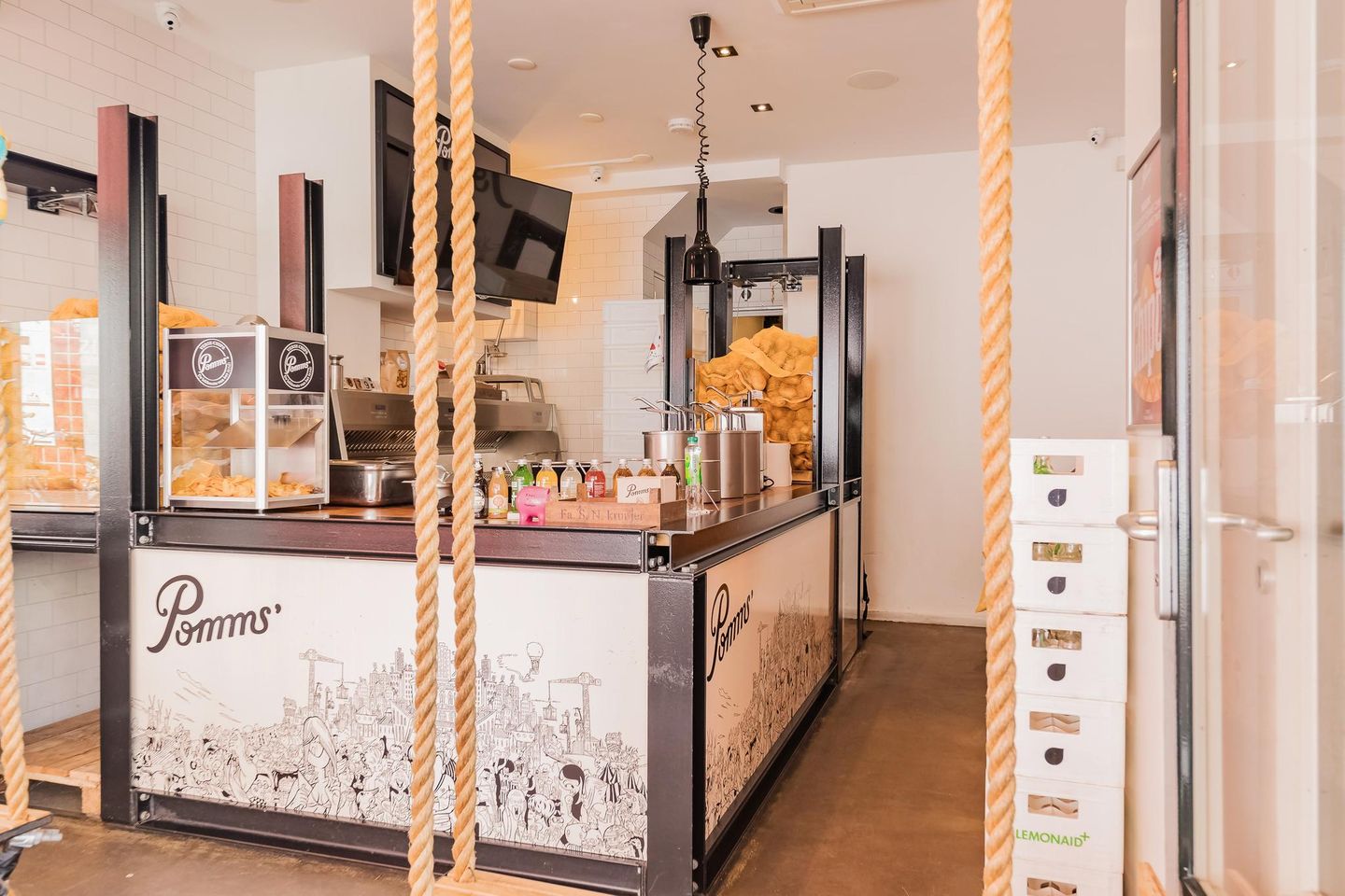 Pomms' heeft een oppervlakte van circa 40m². Deze moderne "frietzaak" kent een hoogwaardige afwerking en heeft kwalitatief goede apparatuur. De huidige formule van Pomms' kenmerkt zich door het serveren van dagelijks vers gesneden en vers gefrituurde frites. De openslaande pui zorg voor een lage drempel en een snelle service.