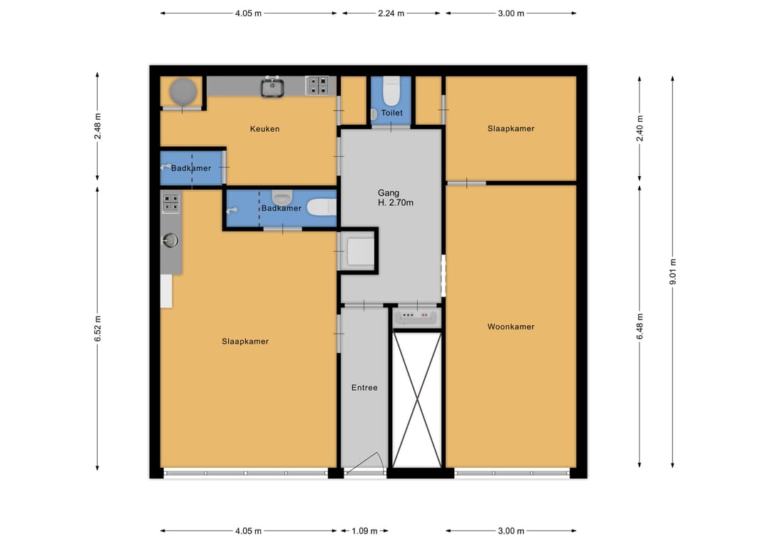 Het betreft twee appartementsrechten (onderdeel van een 'VvE' van 3, maar volledig los van elkaar functionerend), welke twee zijn verdeeld in de volgende wooneenheden.
