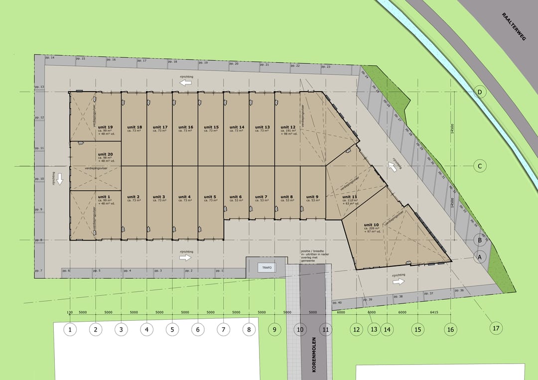 Het bedrijfsverzamelgebouw is onderverdeeld in units variërend van circa 53 m² tot circa 306 m². De units zijn standaard voorzien van een overheaddeur met een hoogte van circa 4,8 meter! Daarnaast zijn er units beschikbaar die optioneel kunnen worden uitgerust met een verdiepingsvloer. Dit maakt het gebouw ideaal voor ondernemingen die behoefte hebben aan opslagruimte en/of werkruimte in combinatie met kantoorruimte. De units zonder verdiepingsvloer hebben een vrije hoogte van circa 6,4 meter, terwijl de units met een verdiepingsvloer een vrije hoogte van circa 3 meter hebben.