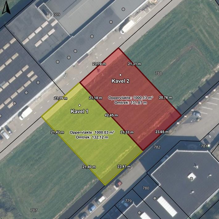 Beide bouwkavels (beiden circa 1.000 m²) maken deel uit van het kadastrale perceel in gemeente Krimpen aan de Lek, sectie B, nummer 788. Het betreft eigendomsgrond en de kavel wordt na de overdracht kadastraal ingemeten door het Kadaster. Eventuele over-, of ondermaat wordt verrekend.