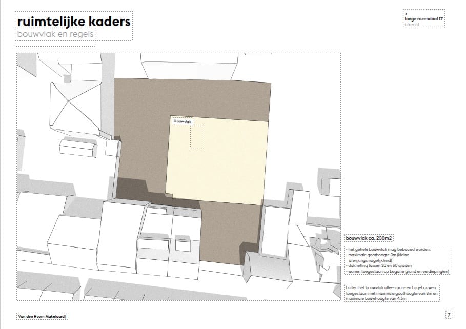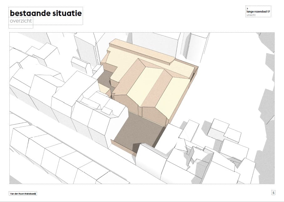 Het perceel bevindt zich op het grensgebied van de buurt de Zeven Steegjes en het deel van de Geertebuurt tussen Oudegracht, Lange Rozendaal en Geertestraat. De voormalige arbeidersbuurt de Zeven Steegjes is gelegen tussen de Oudegracht in het oosten, het terrein van de voormalige Sint-Martinuskerk in het zuiden, de Pelmolenweg in het westen en het Geertekerkhof in het noorden. Het pand Lange Rozendaal 17 is oorspronkelijk gebouwd als remise van de rooms-katholieke ‘Begravenis Vereeniging’. Het pand staat op een terrein achter de straat, dat bereikbaar is via een opening in de straatwand tussen de huisnummers 15 en 21.