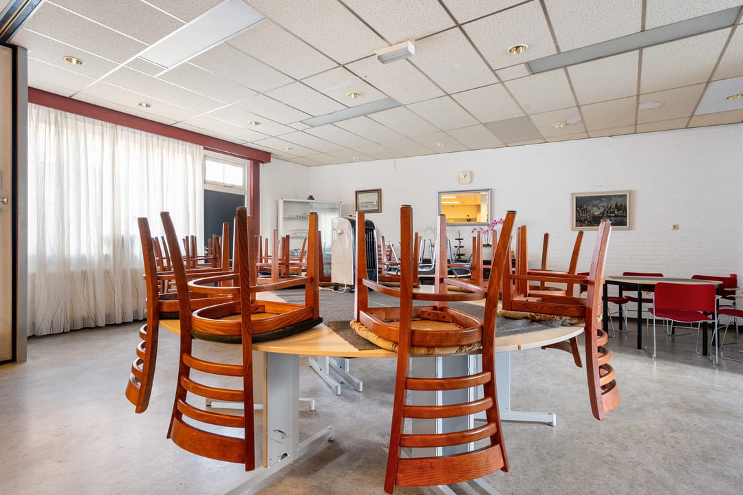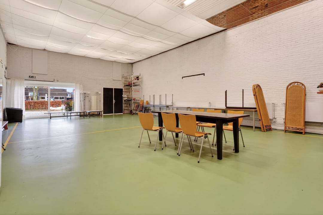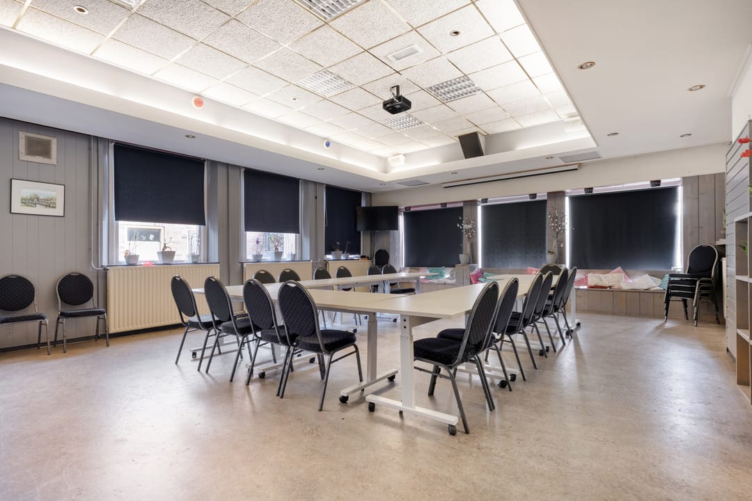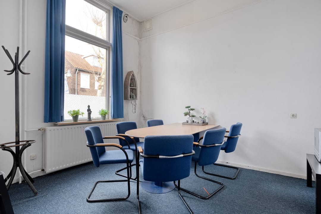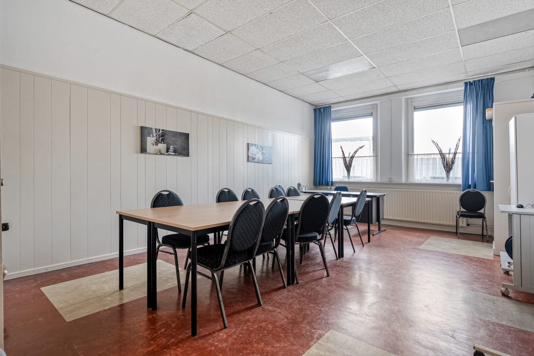 Het pand beschikt over een zeer functionele en veelzijdige indeling. Op de begane grond en verdieping zijn meerdere vergaderruimtes en kantoorruimtes aanwezig, evenals een ruime eetzaal met keukenfaciliteiten. Daarnaast beschikt het gebouw over een theaterzaal, geschikt voor bijeenkomsten, presentaties of culturele activiteiten. Op de eerste verdieping bevindt zich bovendien een appartement met dakterras, wat het object extra bijzonder maakt. De verschillende ruimtes maken het pand uitermate geschikt voor diverse doeleinden en combinaties daarvan.