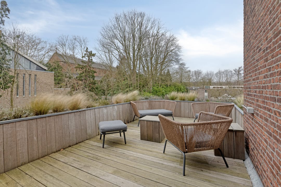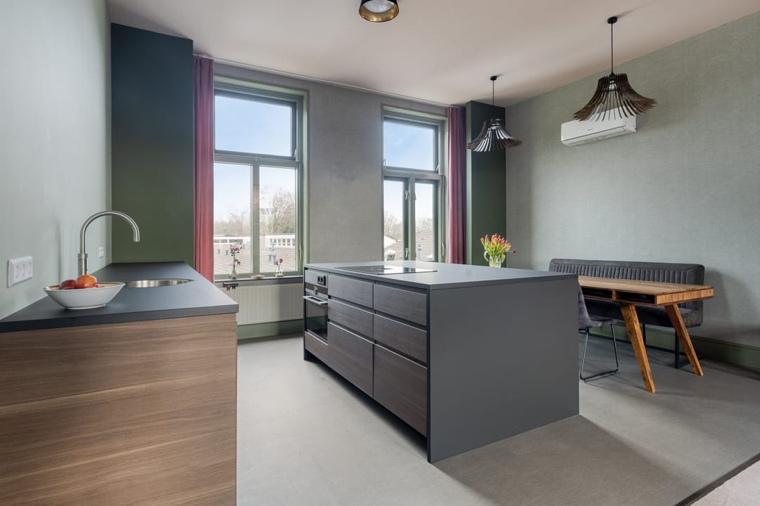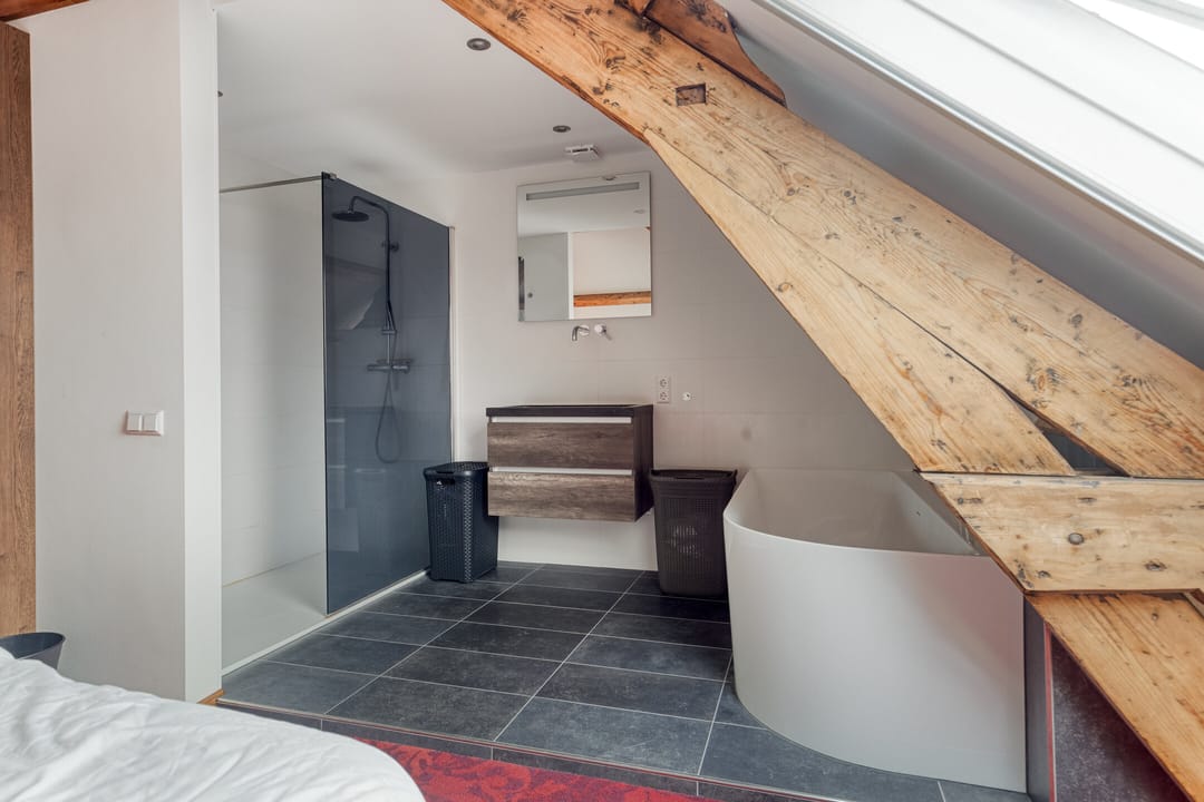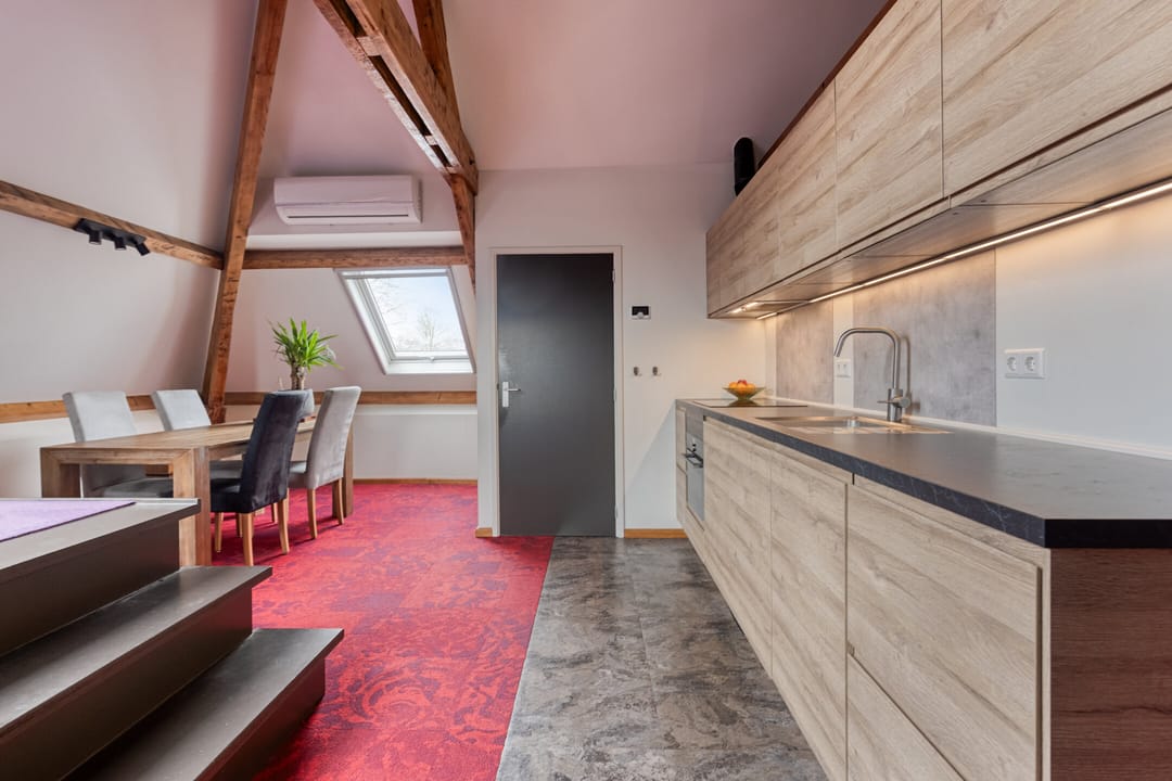 Ook de tweede verdieping wordt gebruikt als appartement. Deze verdieping beschikt over een lichte woonkamer voorzien van een Velux balkonvenster, een open keuken en een slaapruimte met badkamer en suite, wat zorgt voor een aangename en zelfstandige woonomgeving.