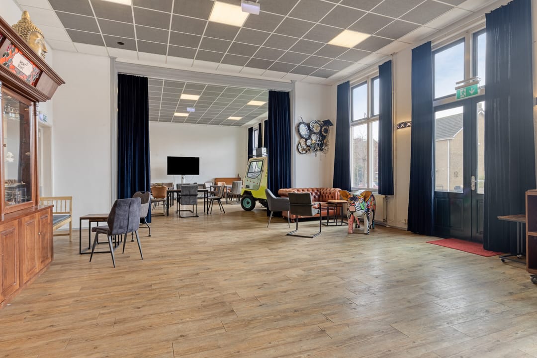 zaal / open ruimte, wandafwerking stucwerk, houten vloer, systeemplafond, openslaande deuren naar voorzijde;