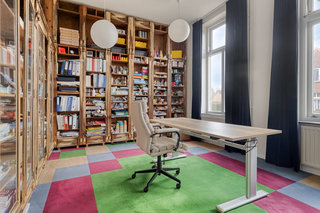 Op de begane grond bevinden zich diverse werkkamers, toiletten en een keuken. Daarnaast beschikt deze verdieping over een royale zaalruimte die zich uitstekend leent voor presentaties, vergaderingen, creatieve werkplekken of eventueel aanvullende woonruimte, ook een winkel of bedrijf behoort tot de mogelijkheden. Dankzij de praktische indeling en de ruime opzet biedt deze verdieping volop mogelijkheden voor uiteenlopende vormen van gebruik.