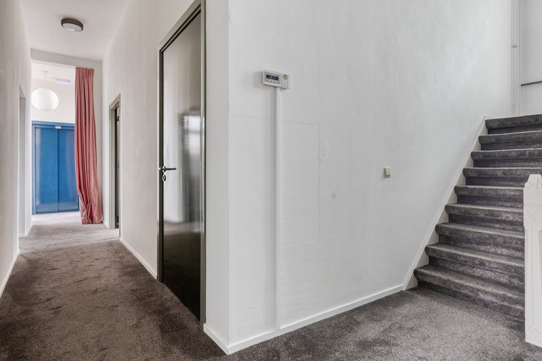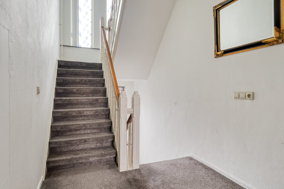 Overloop met een vaste trap naar de 2e verdieping, wandafwerking glasvezelbehang, vloer afgewerkt met tapijt, plafond afgewerkt met spuitwerk;