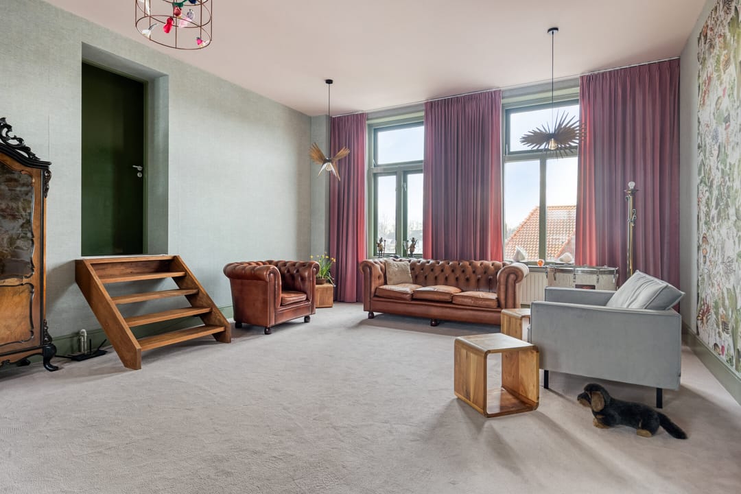 woonkamer voorzien van een airco-installatie, wandafwerking stucwerk en behang, vloer afgewerkt met tapijt, plafond afgewerkt met stucwerk, deur naar zolderruimte;