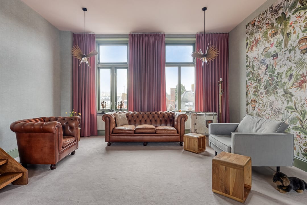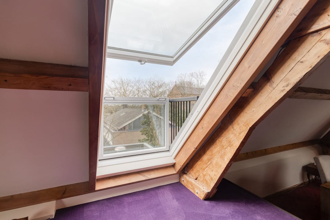 woonkamer voorzien van Velux dakramen inclusief verduistering en horren, airco-installatie en een Velux balkonvenster, wandafwerking stucwerk, vloer afgewerkt met tapijt, dakbeschot in het zicht;