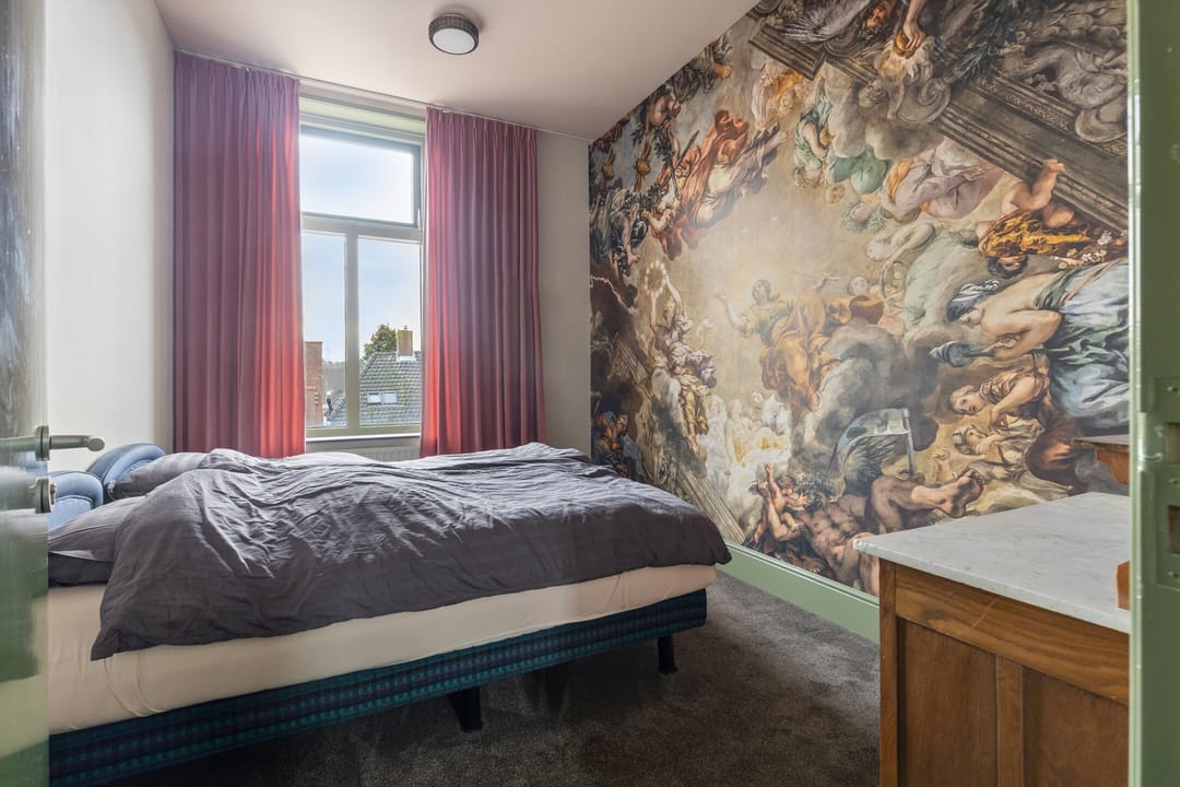 slaapkamer midden voor, wandafwerking behang, vloer afgewerkt met tapijt, plafond afgewerkt met stucwerk;