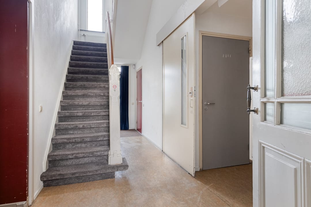 Hal/entree met een trap naar de 1e verdieping, wandafwerking stucwerk, linoleum vloer, plafond afgewerkt met stucwerk;