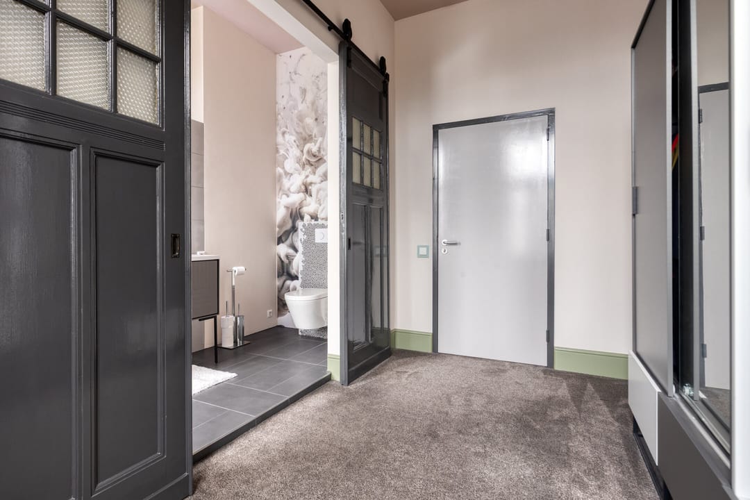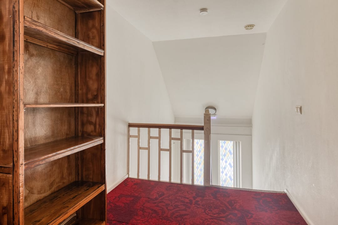Overloop, wandafwerking stucwerk, vloer afgewerkt met tapijt, plafond afgewerkt met stucwerk;