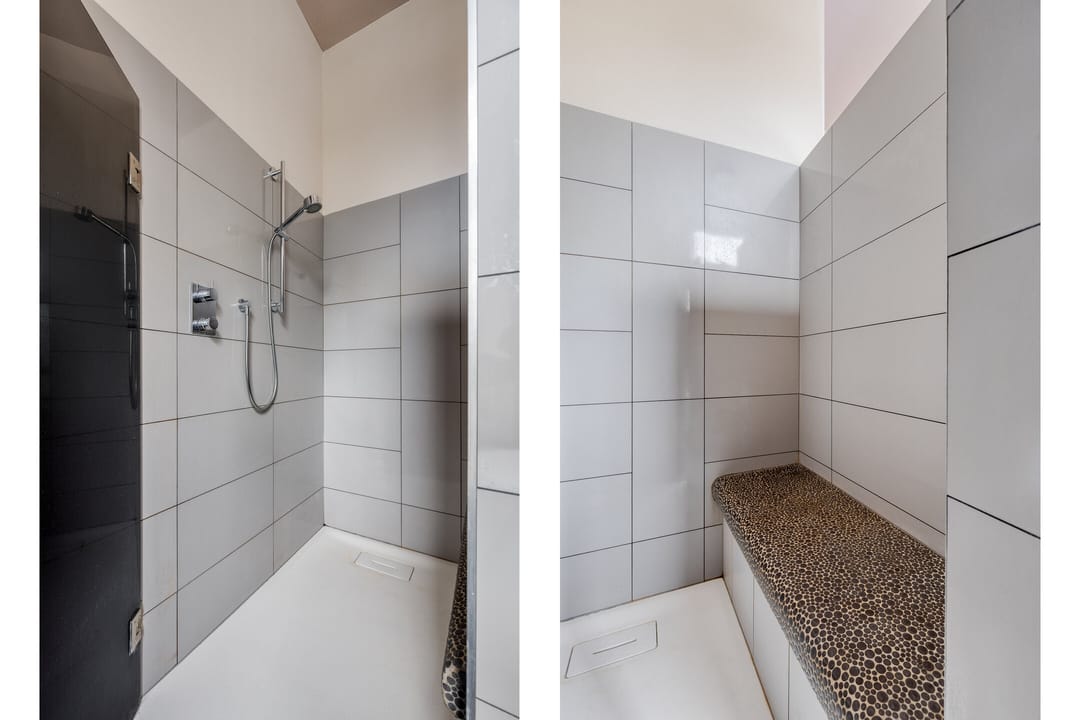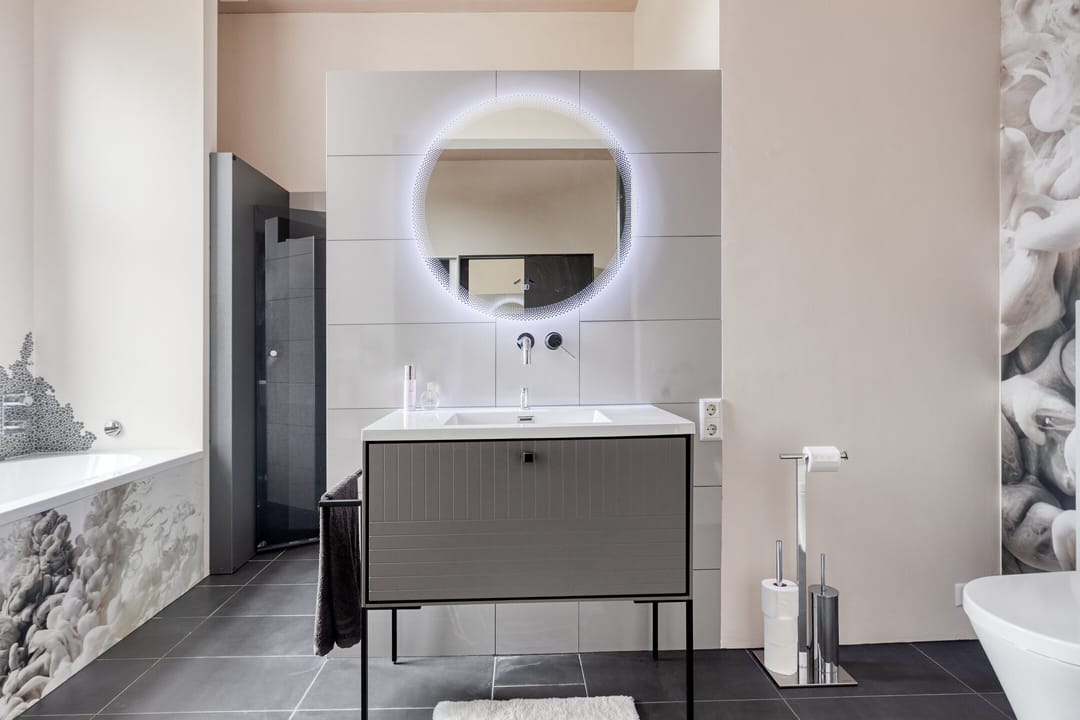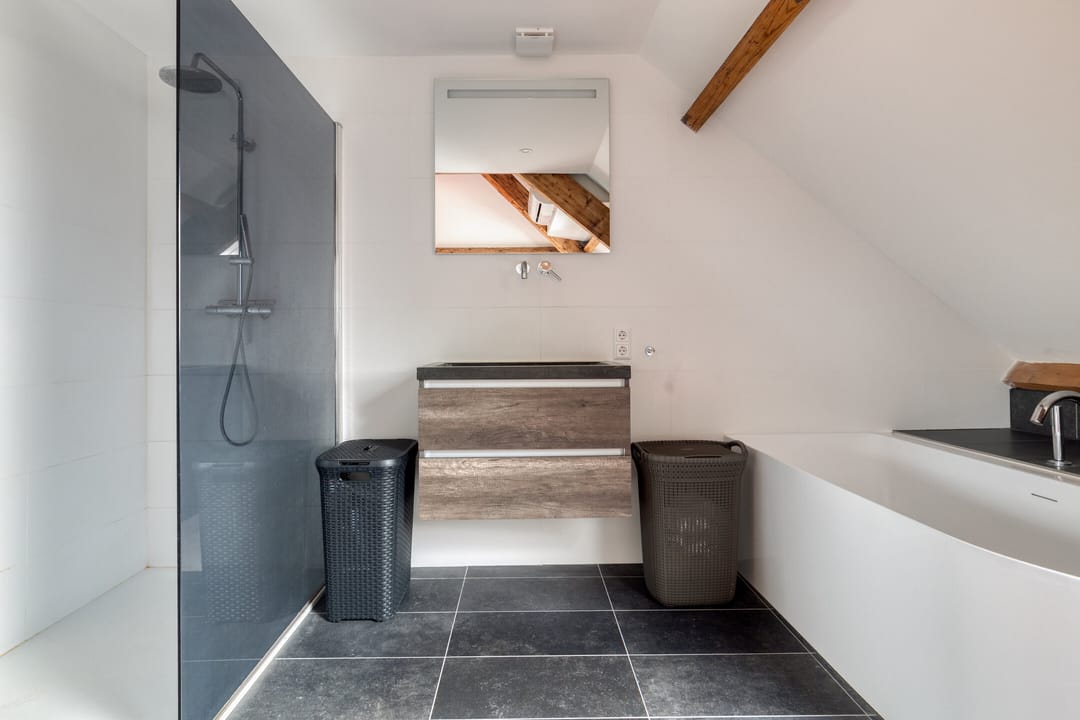 modern betegelde badkamer, voorzien van een ligbad, inloopdouche, wandcloset, badkamermeubel met een wastafel, kast vv. wasmachine-/drogeraansluiting, elektrische vloerverwarming en mechanische ventilatie;