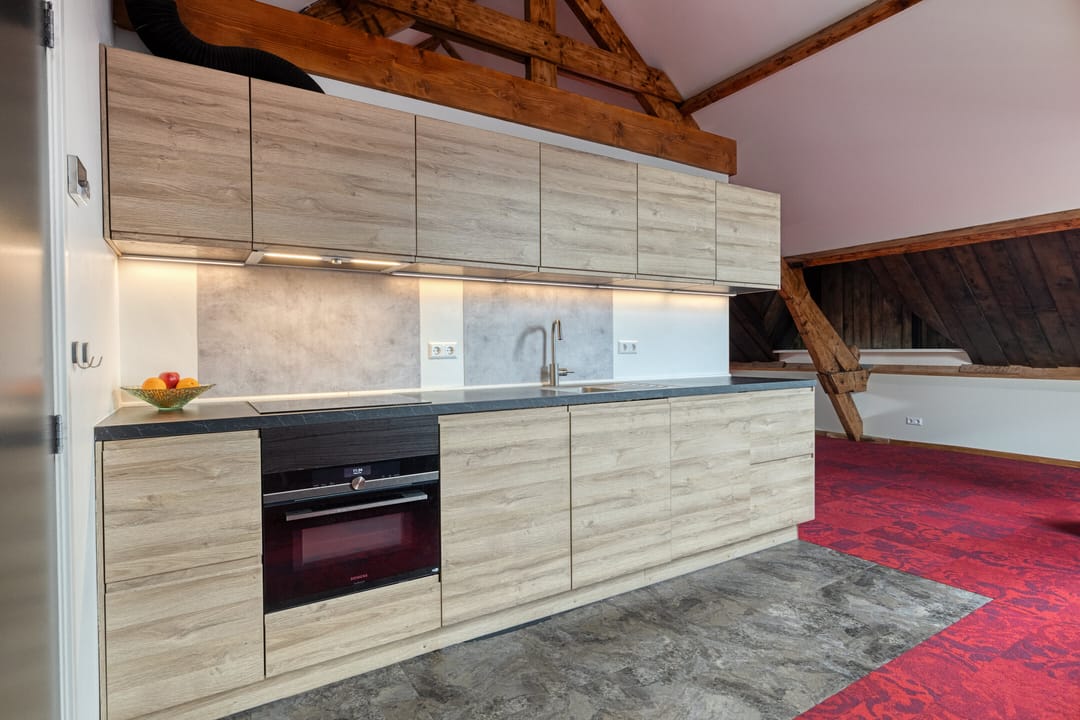 open keuken, waarin geplaatst een in de lengte opgestelde inbouwkeuken met een kookeiland en bargedeelte, voorzien van een kunststof aanrechtblad met een spoelbak, inbouw inductie kookplaat met een geïntegreerd afzuigsysteem, -koelkastlade, -combi oven/magnetron en een vaatwasser, wandafwerking stucwerk, vinyl vloer, plafond afgewerkt met stucwerk, trapje met deur naar zolderruimte;
