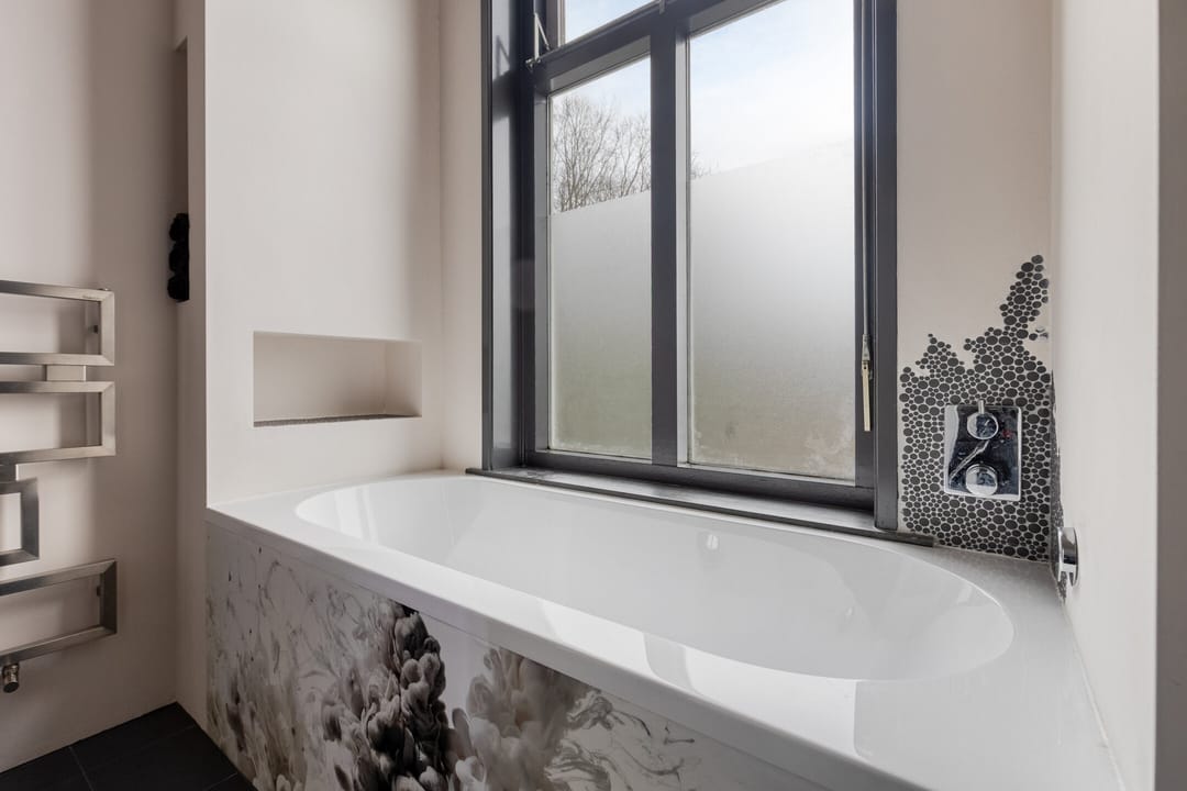 betegelde badkamer en suite, voorzien van een inloopdouche, bad en een wastafelmeubel met een wastafel;