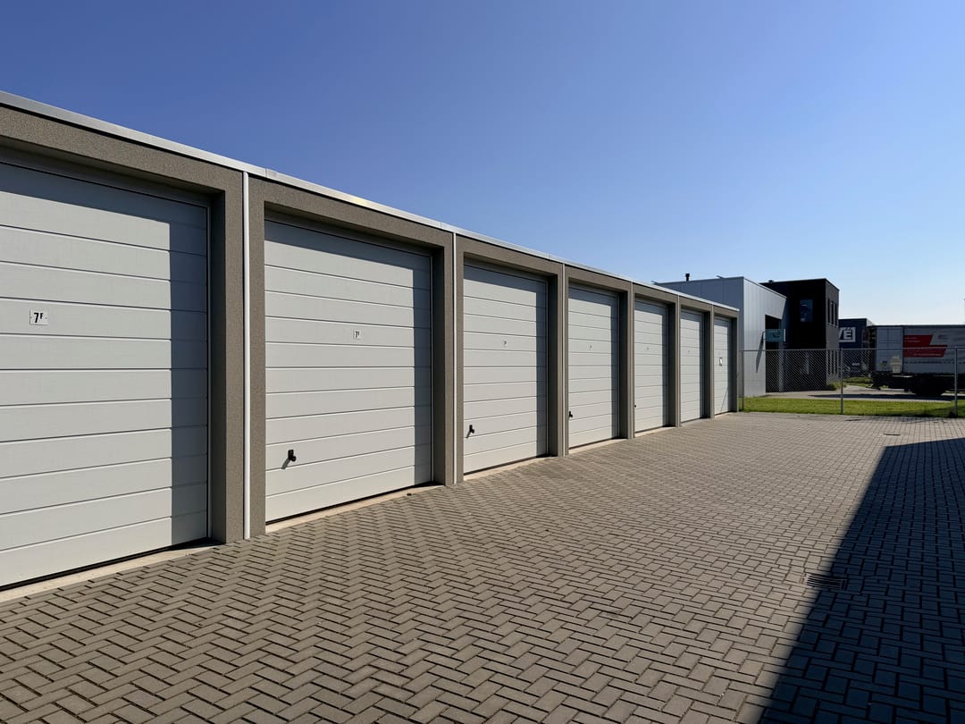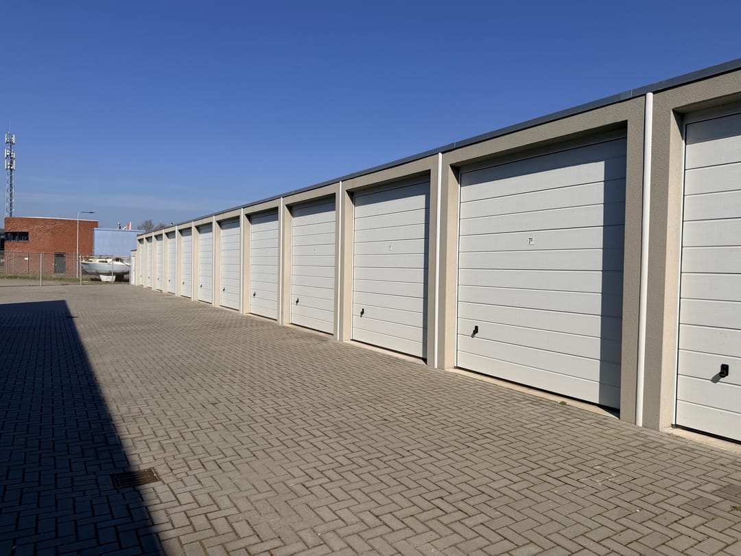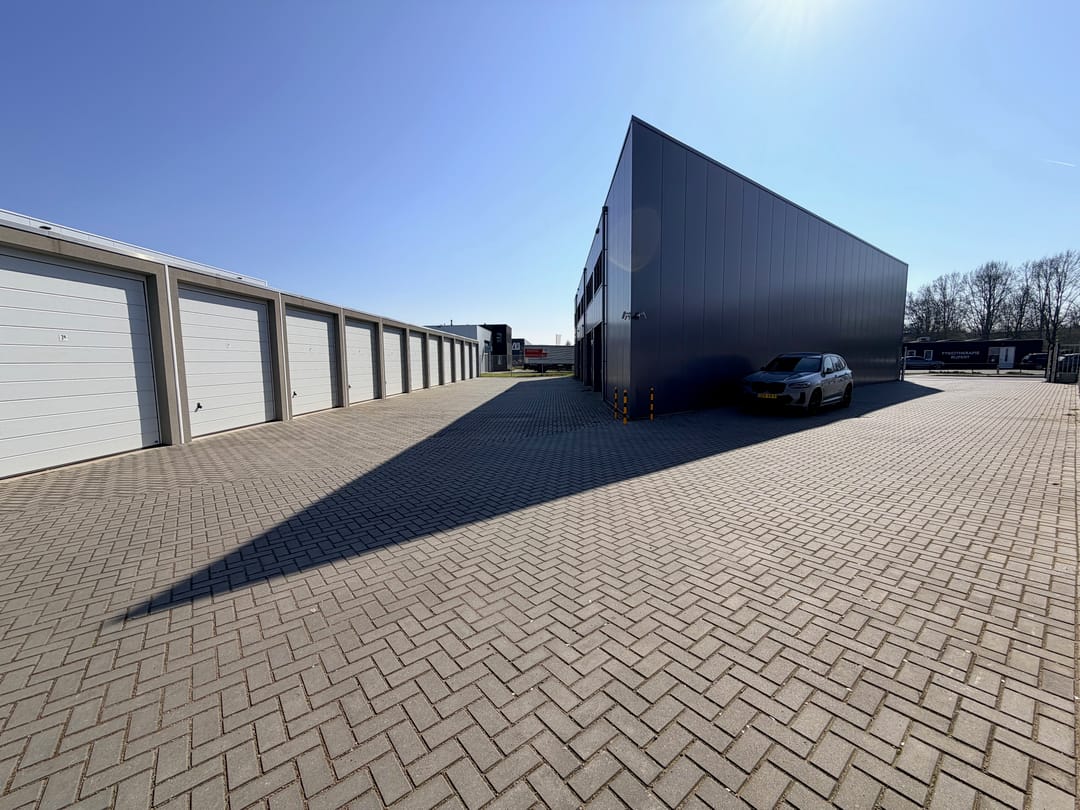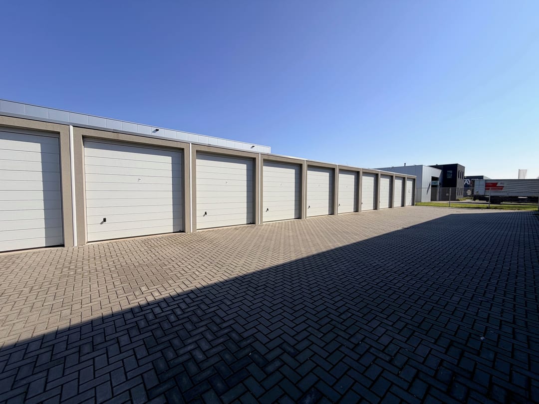 De netjes afgewerkte ruimte is voorzien van een betonvloer, elektra met krachtstroom, verlichting en overheaddeur (doorrijhoogte 2,98 m). Er is een gezamenlijk toilet en het buitenterrein is afsluitbaar met een elektrische poort.