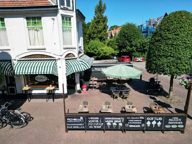Lunchroom-snackbar Pico Bello is sinds lange tijd gelegen op deze bekende hoekligging tegenover de Hema. Vele klanten waaronder de bewoners van Bloemendaal en omgeving, passanten en ook toeristen weten deze fijne plek al decennia te vinden. Dit object is één van de weinige objecten met horeca bestemming in Bloemendaal.