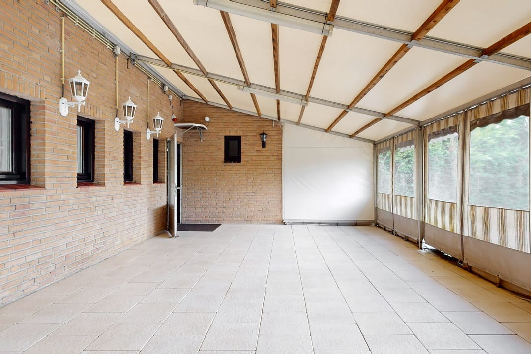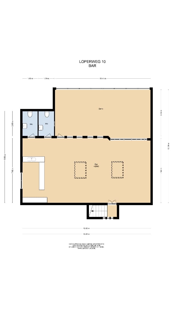 Achter het pand bevindt zich een terras. Vanuit het terras bereik je de zaal met bar, separate toiletten en serre (150 m²). Het perceel is tevens vanuit de achterzijde toegankelijk.