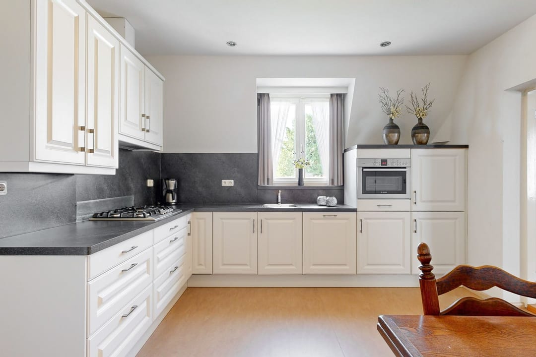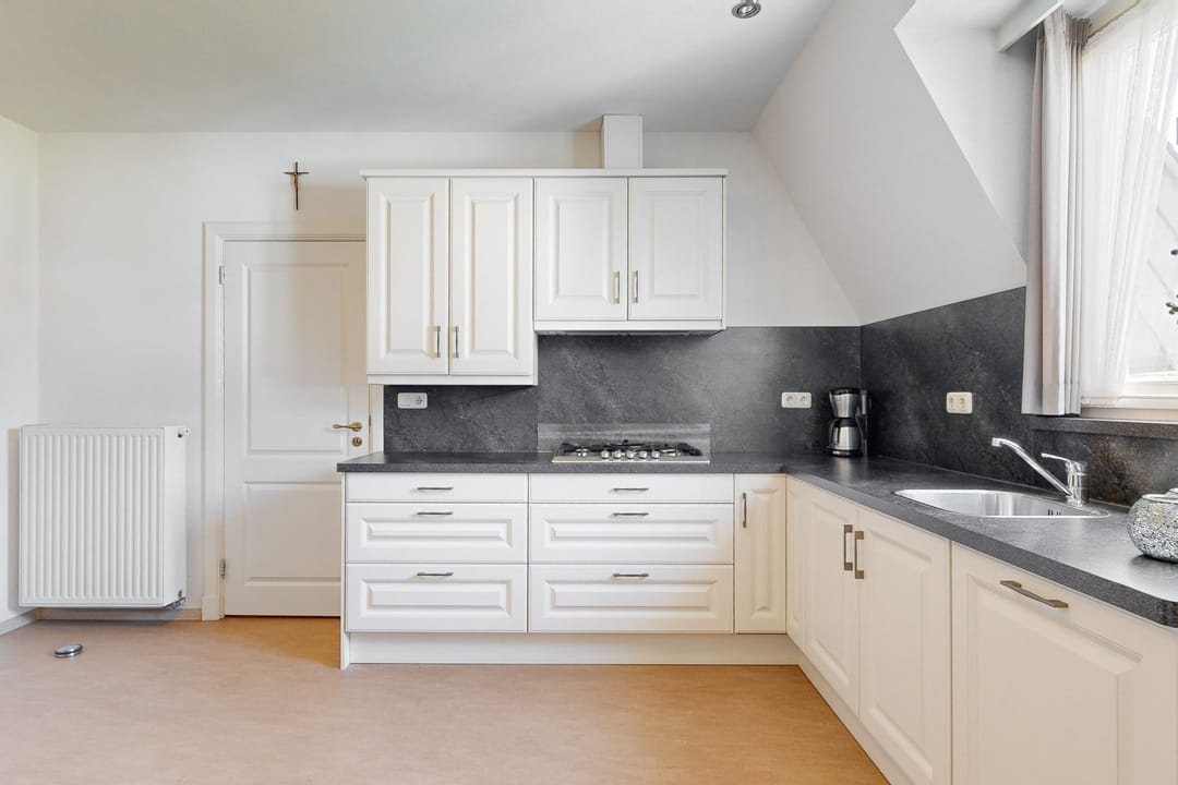 Overloop met toegang tot de keuken, 2 slaapkamers en badkamer. De dichte keuken is 16 m² en voorzien van inbouwapparatuur, zoals een gaskookplaat, afzuigkap, combimagnetron, vaatwasser en koelkast. Vanuit de keuken bereik je de woonkamer (39 m²). Naast de woonkamer bevindt zich een gang waar eventueel een toegang tot de tweede verdieping gemaakt kan worden.