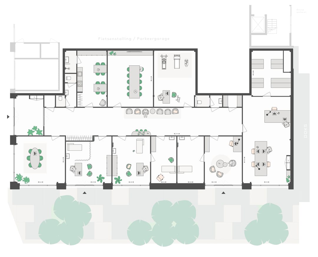 Buiten is er ook volop ruimte om tussendoor te ontspannen of een broodje te eten. In het plan wordt een gemeenschappelijk binnenpark tussen de gebouwen gerealiseerd. De jaarronde begroeiing en de vele bomen geven het een rijk parkgevoel. Er staan bankjes waar je samen met collega’s kan aanschuiven en even kan ontspannen.