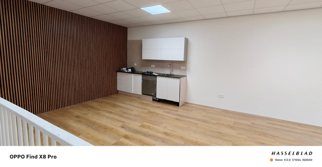 Boven vind je een volledig afgewerkte kantoorverdieping met o.a. een laminaatvloer, vloerverwarming via warmtepomp, een moderne pantry en een modern toilet.