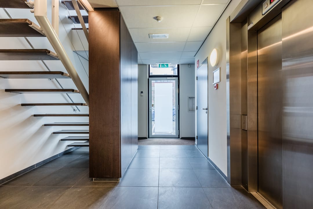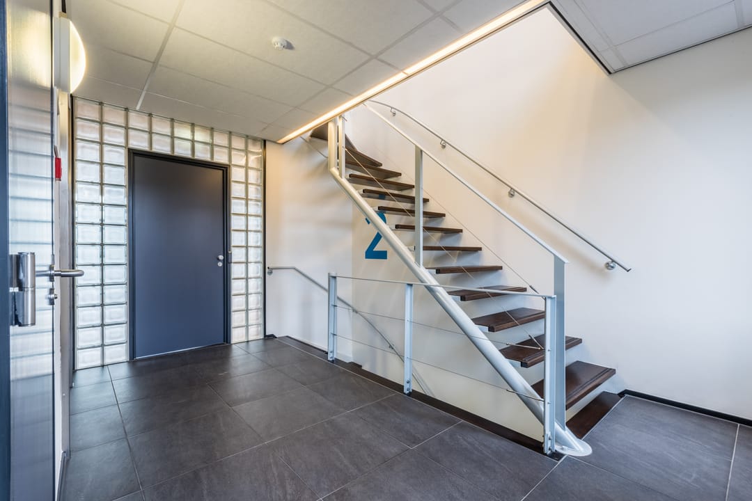 Dankzij de combinatie van een centraal trappenhuis, met lift, almede de glazen vide, met trap, zijn de eerste verdieping en tweede verdieping uitstekend gezamenlijk te huren.