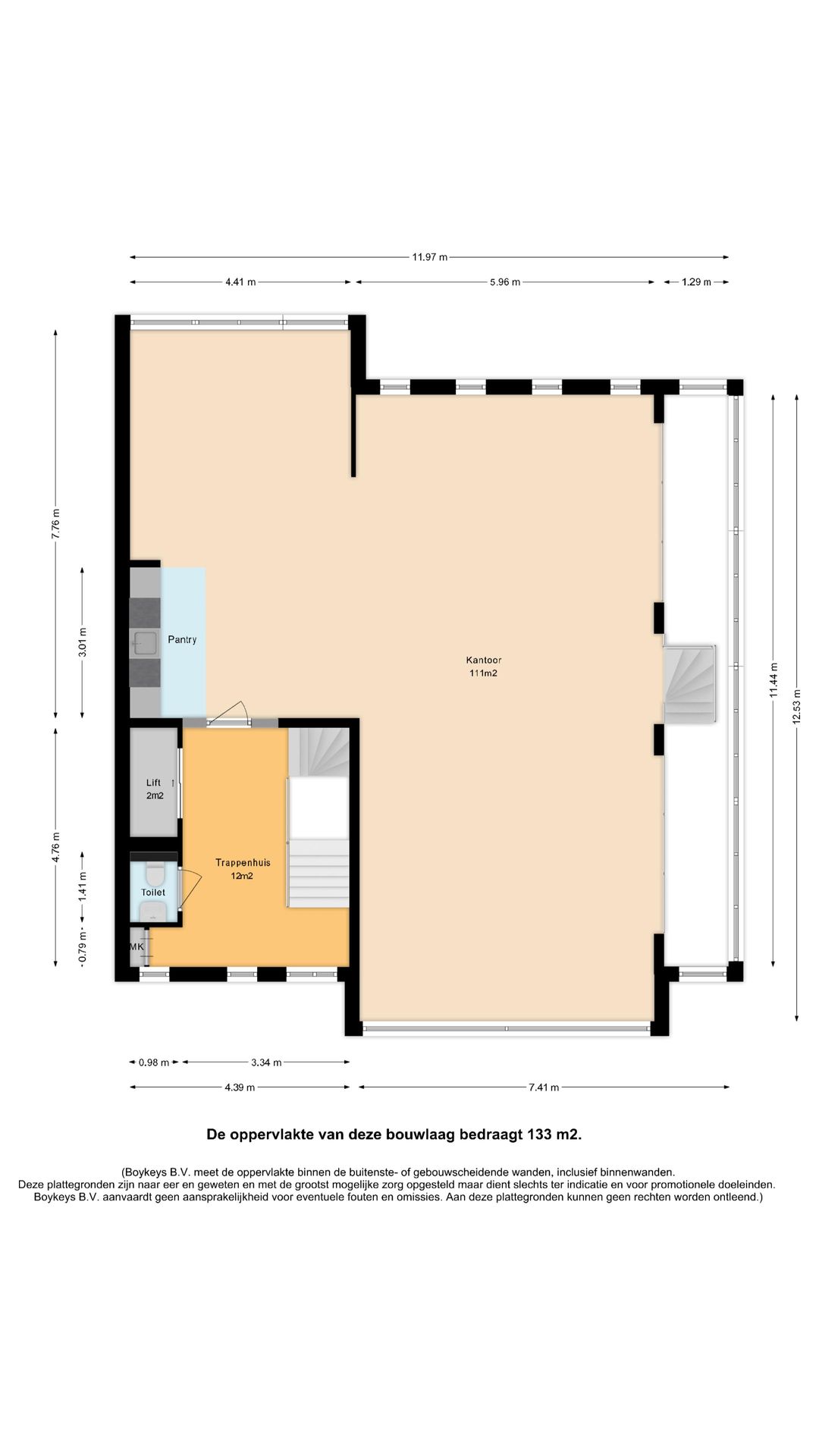 Ook de tweede verdieping (162 m²) beschikt over een eigen pantry in de kantoorruimte alsmede een toilet in de hal. De verdieping kenmerkt zicht door een open structuur c.q. kantoortuin.