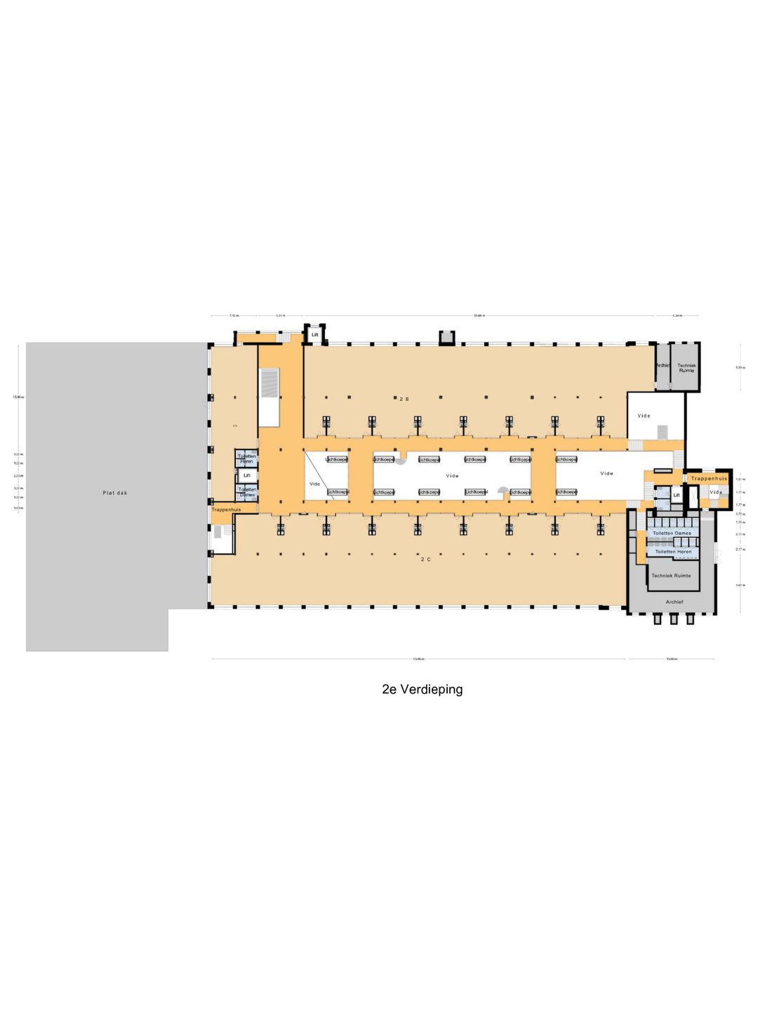 Op de tweede verdieping is circa 2.550 m² beschikbaar, deelverhuur is bespreekbaar.