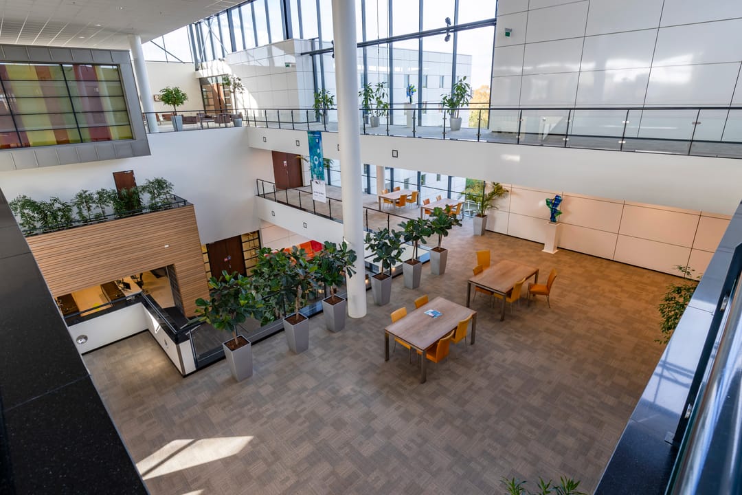ruime, lichte ruimtes die samenwerking en creativiteit bevorderen. De hoogwaardige afwerking en het gebruik van duurzame materialen dragen bij aan de professionele uitstraling en de lange termijn waarde van het gebouw. De centrale entree ondergaat een ingrijpende renovatie en wordt een plek waar rust, groen en esthetiek samenkomen. Naast een harmonieuze en uitnodigende sfeer worden er diverse faciliteiten gerealiseerd, waaronder restaurant, multimedia center, vergaderzalen en een exclusieve