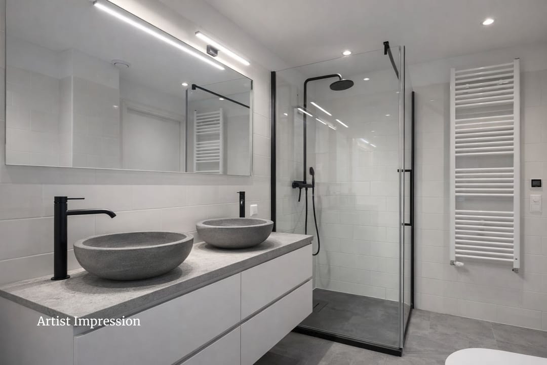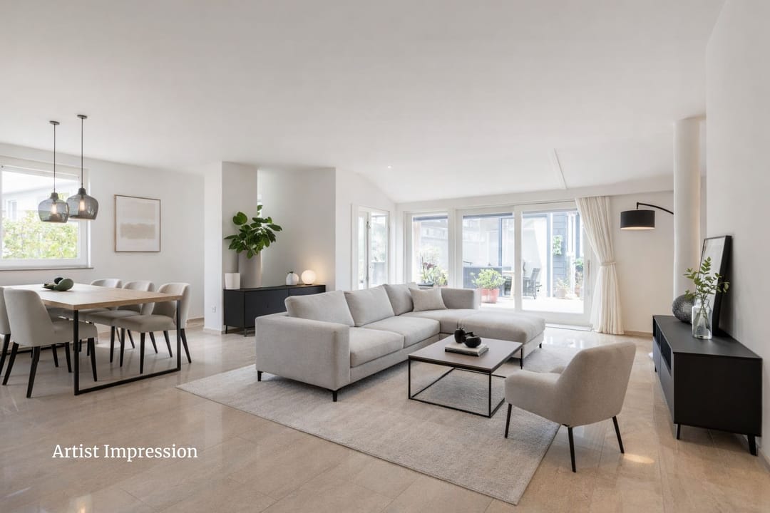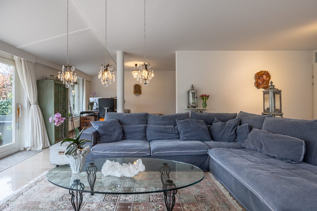 The modern Siematic kitchen is equipped with high-end built-in appliances, including a Miele induction cooktop, Gaggenau wok burner, Siemens microwave, dishwasher, and a spacious Liebherr fridge/freezer combination. The granite flooring comes with comfortable underfloor heating, and the smooth plastered walls provide a clean finish. The entire home has connections for TV, radio, and internet.