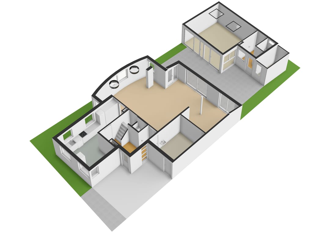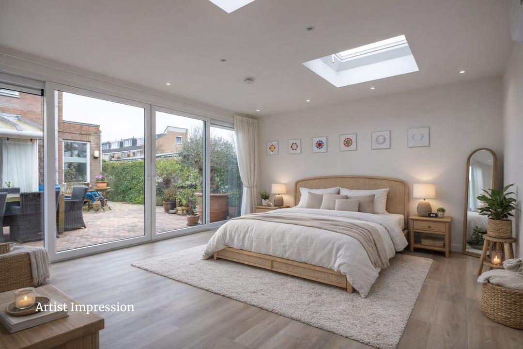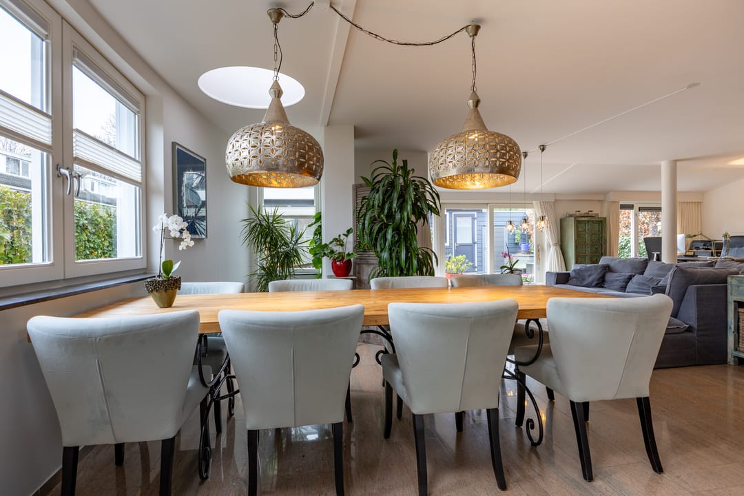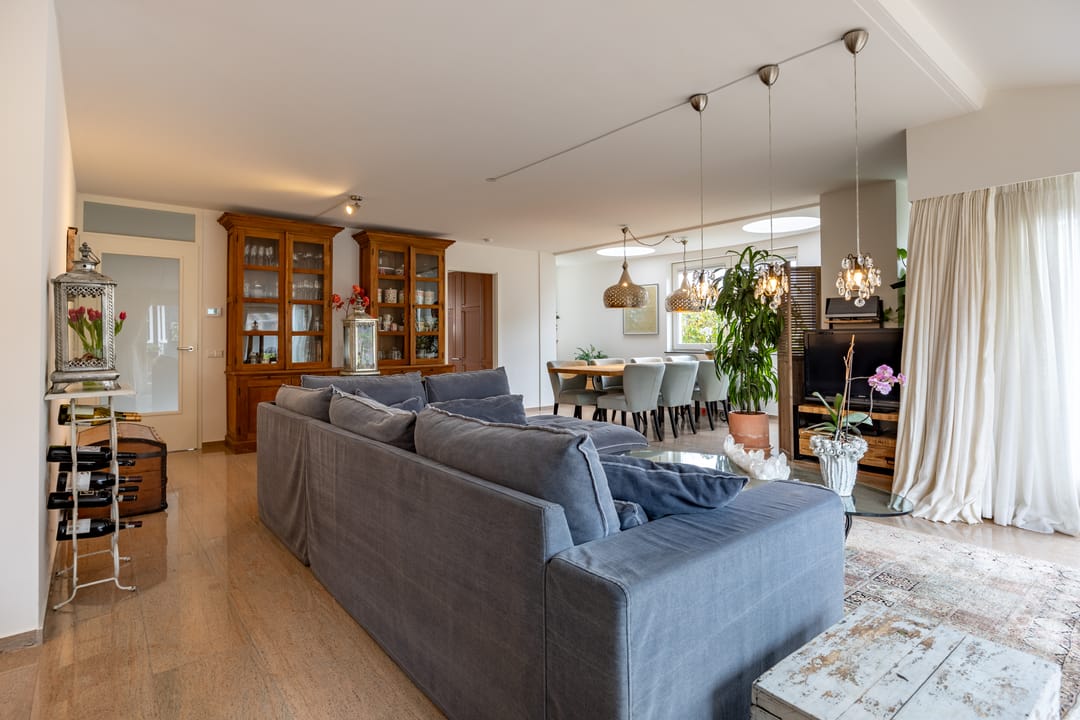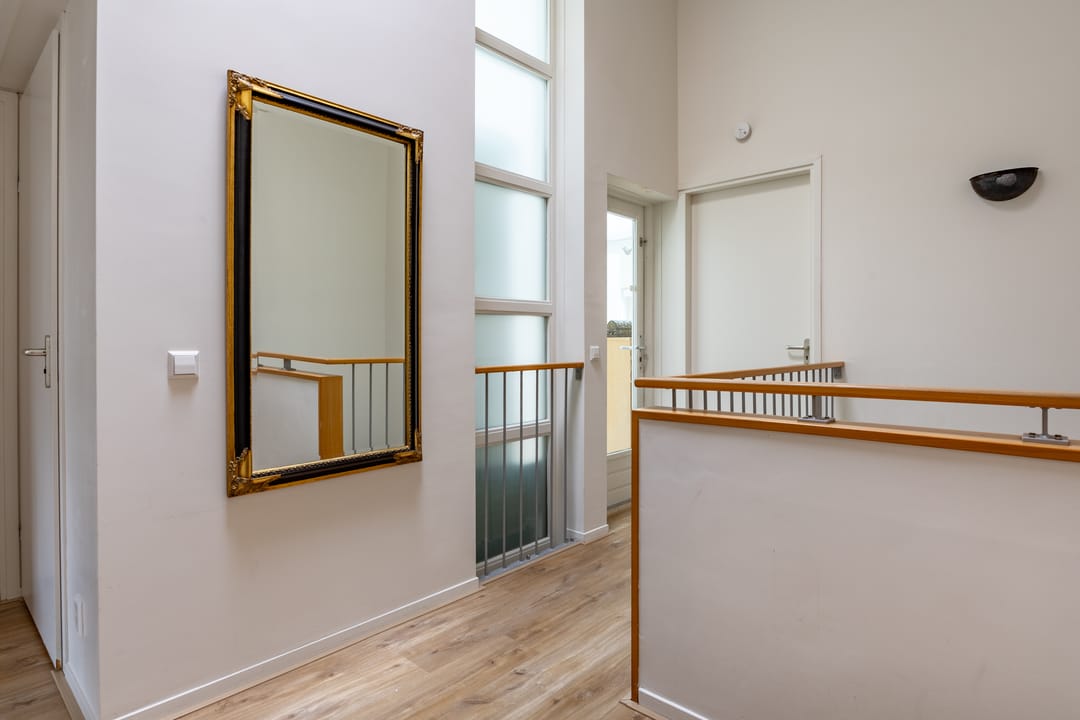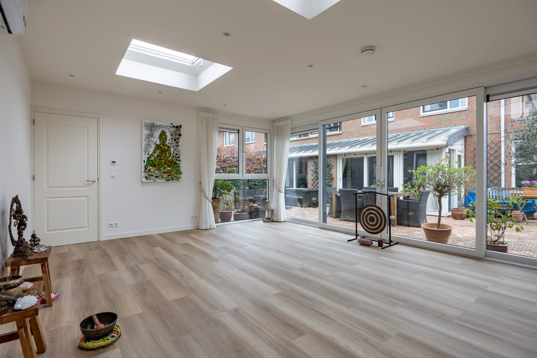 You enter the home through a spacious hallway with a mezzanine and skylight, immediately noticing the abundance of daylight. The large living room features expansive windows and two skylights, creating a bright and open atmosphere. From here, you have direct access to the sunny, west-facing garden. Thanks to the corner location, you'll enjoy sunlight all day long!
