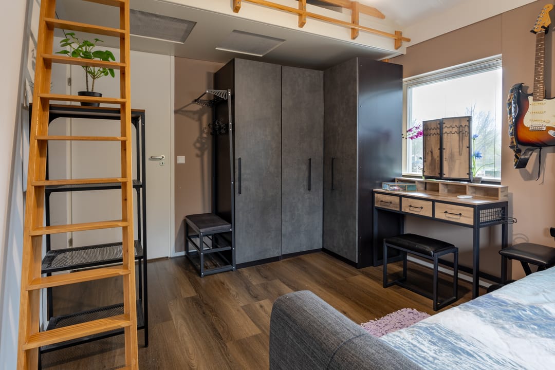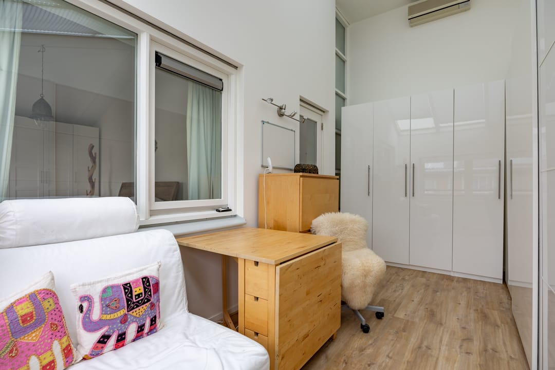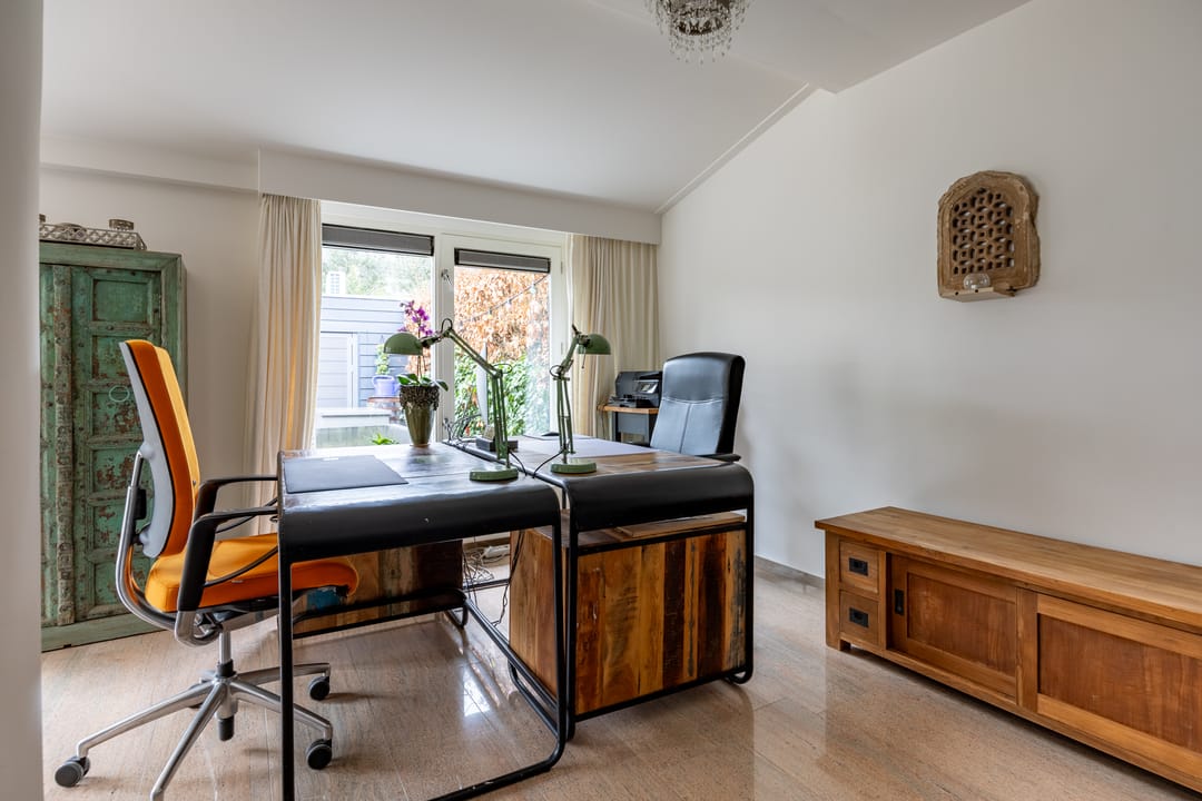 On the first floor, you’ll find four spacious bedrooms and a separate study, all equipped with air conditioning. Two of the bedrooms feature mezzanines with loft beds, perfect as extra lounge or storage space. At the rear, two rooms have been combined into one large bedroom, though this can easily be reverted to the original layout if desired.