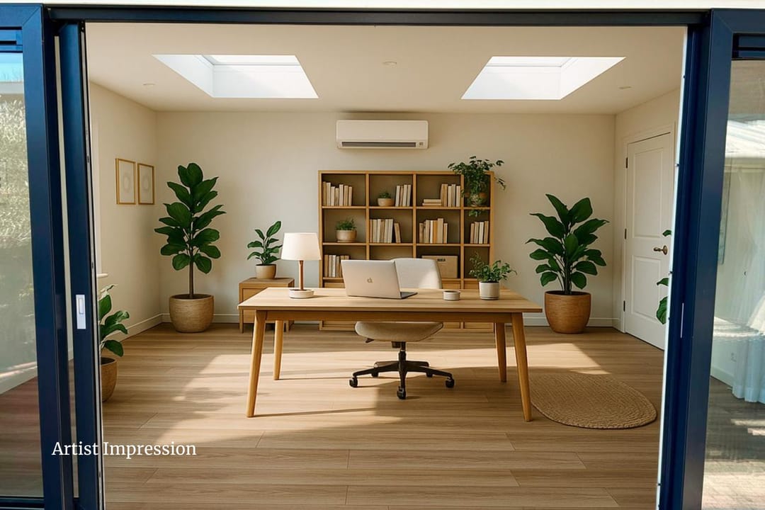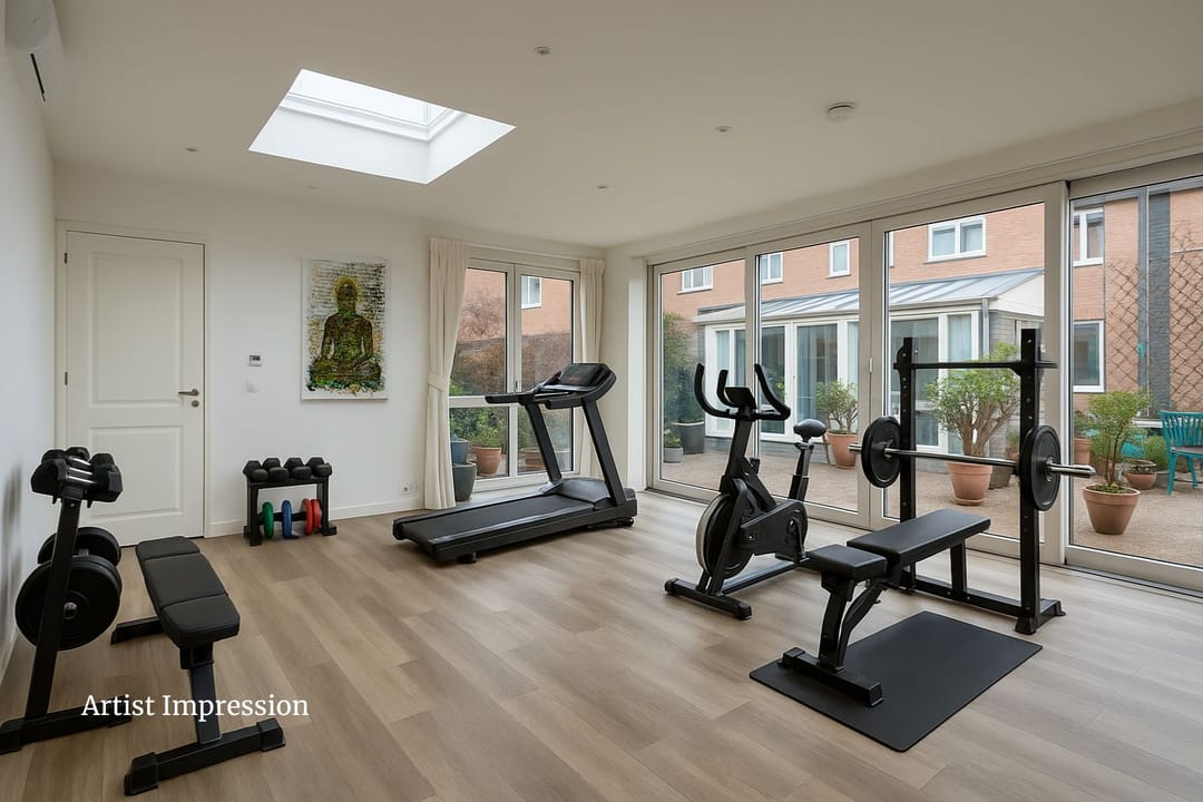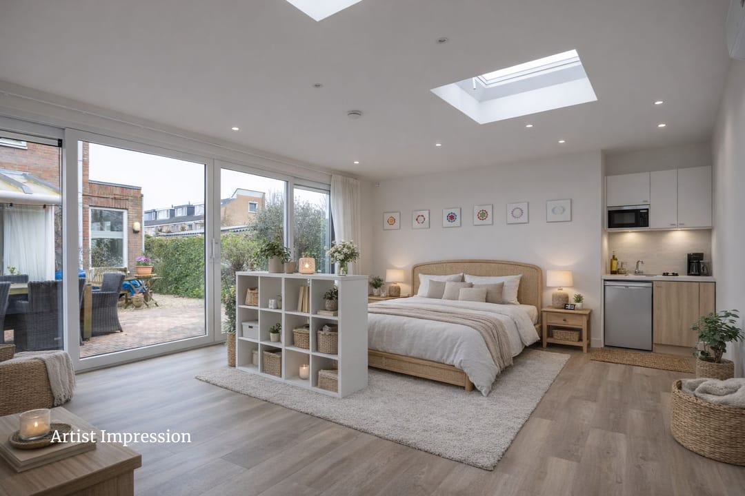 The true eye-catcher is the fully insulated, permit-approved detached garden room, currently in use as a yoga studio. With its own entrance, toilet, and complete privacy, it is ideal for use as an office, practice, studio, or creative workspace. It could also be suitable as a care unit for a live-in family member.