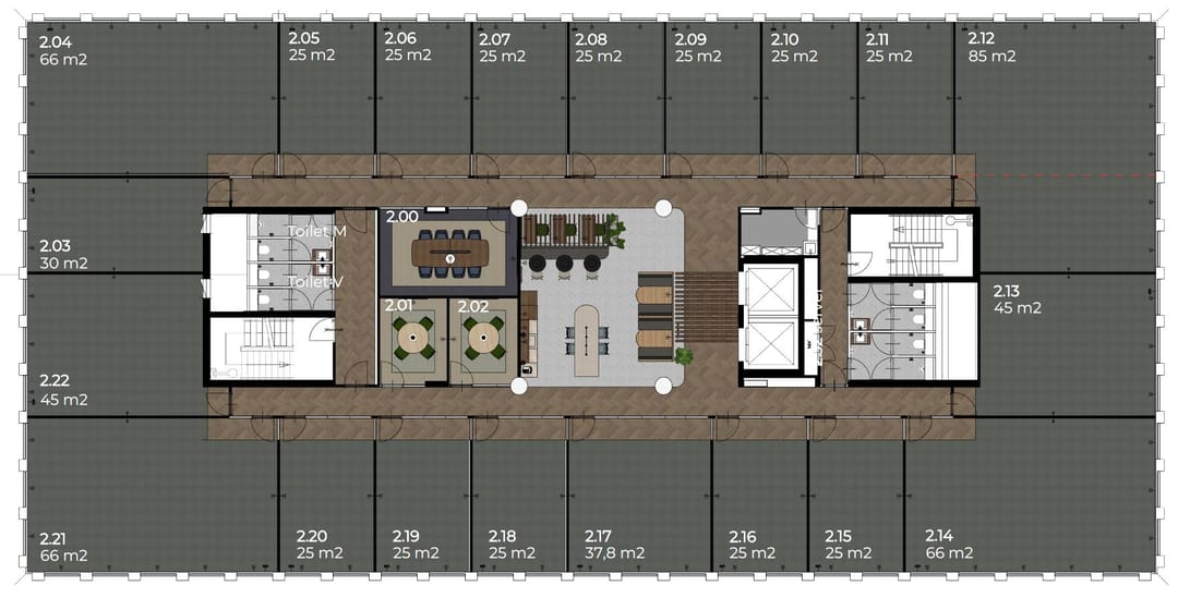 De kantoren bevinden zich op de tweede en zesde verdieping van het gebouw en kunnen flexibel met elkaar worden gecombineerd tot grotere kantooroppervlaktes, afhankelijk van de behoefte van de huurder. Voor de verhuur zijn de volgende types beschikbaar: