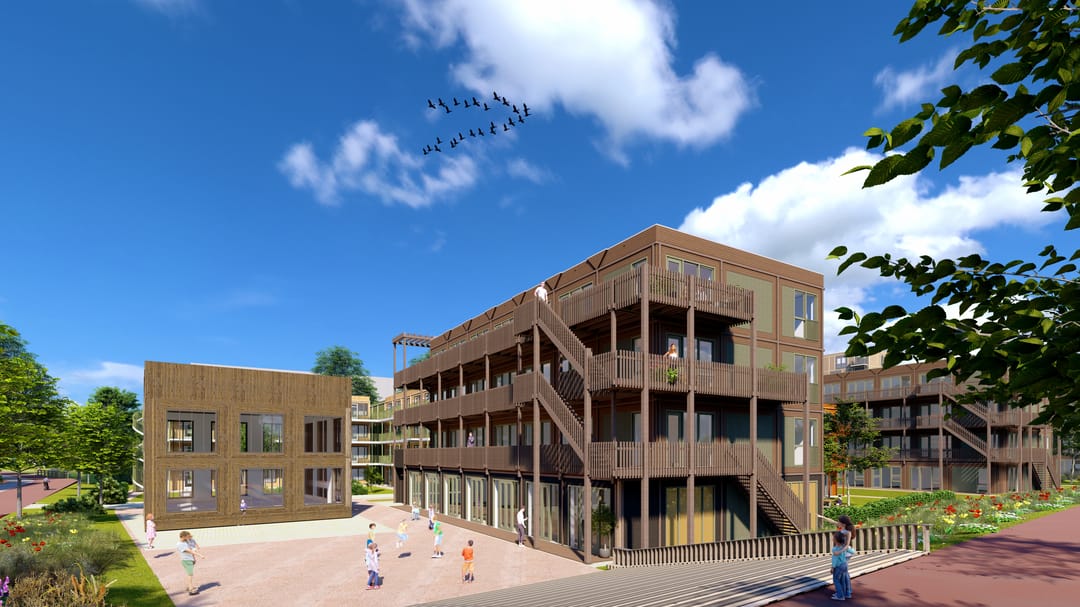De bedrijfsruimte maakt deel uit van een levendig en eigentijds wooncomplex met een warme, natuurlijke uitstraling dankzij de houten gevelbekleding. De omgeving is vriendelijk, uitnodigend en sociaal van karakter, perfect passend bij een maatschappelijke invulling van de ruimte.