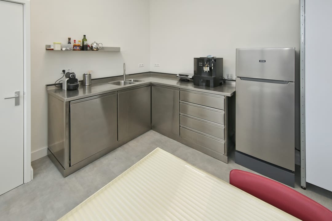 Ruime entree bij binnenkomst, verdeeld over twee kantoorruimtes met mogelijkheid om naar de (gemeenschappelijke) patio te gaan, nieuwe pantry en nieuw geplaatste keuken voorzien van Quooker. Centrale trap naar de eerste verdieping.