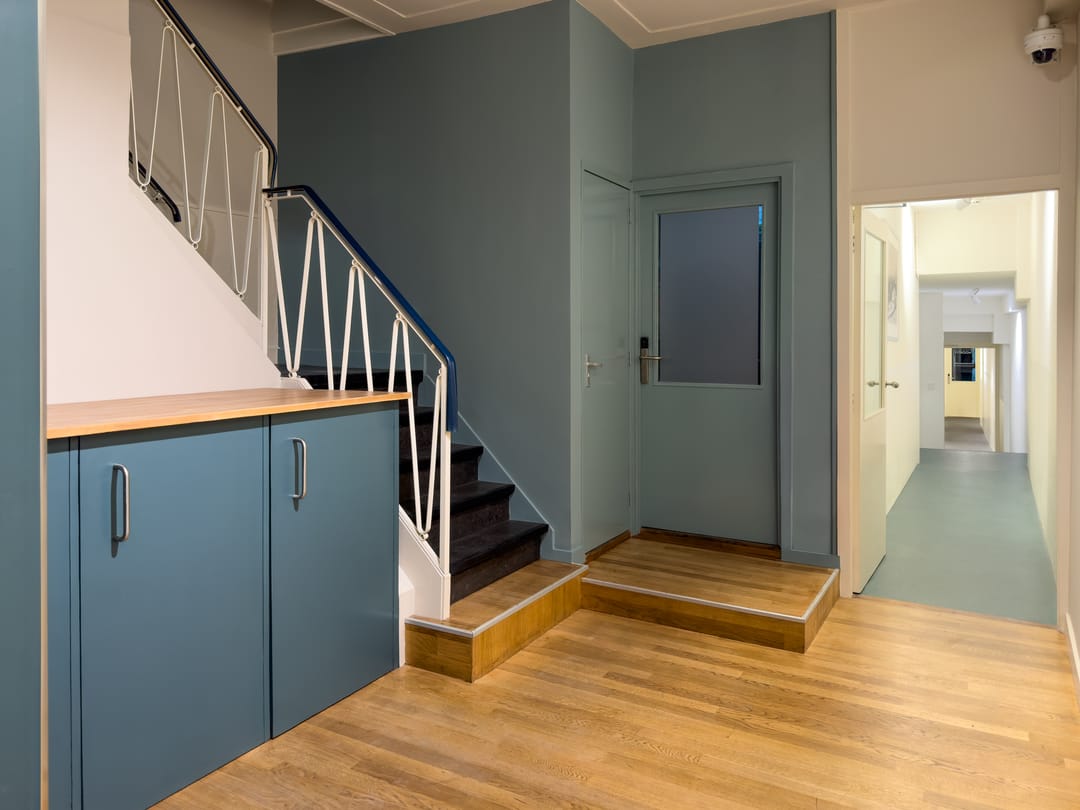 - Air conditioning, mechanical ventilation, peak cooling, built-in fittings, windows can be opened, cable ducts, modular ceiling, toilet, pantry, heating and room layout