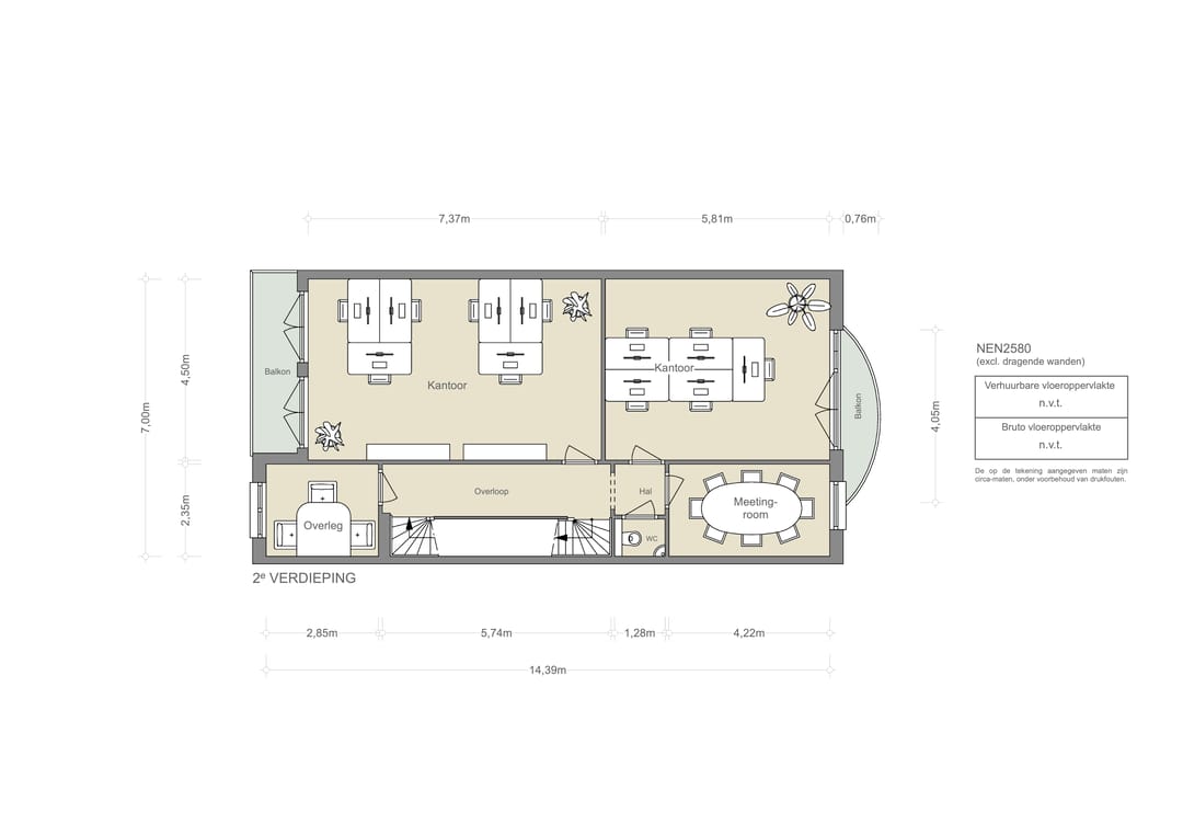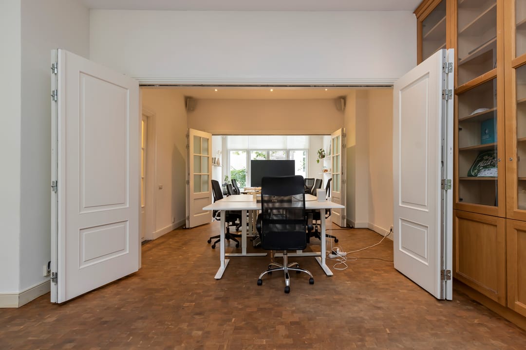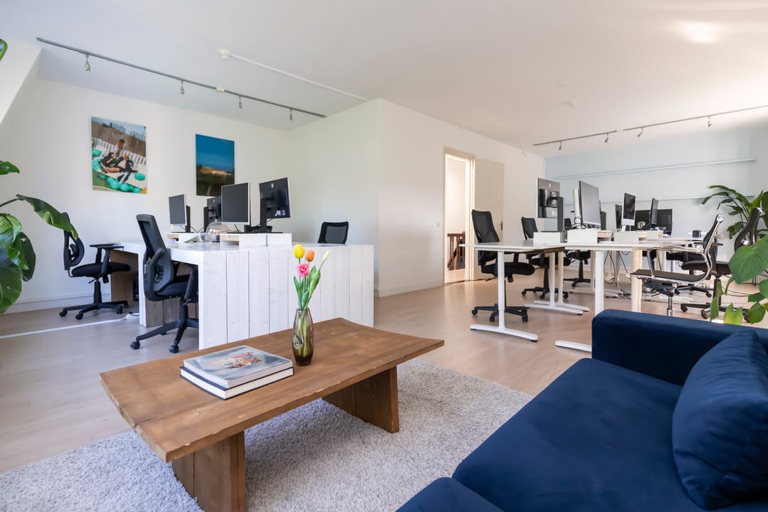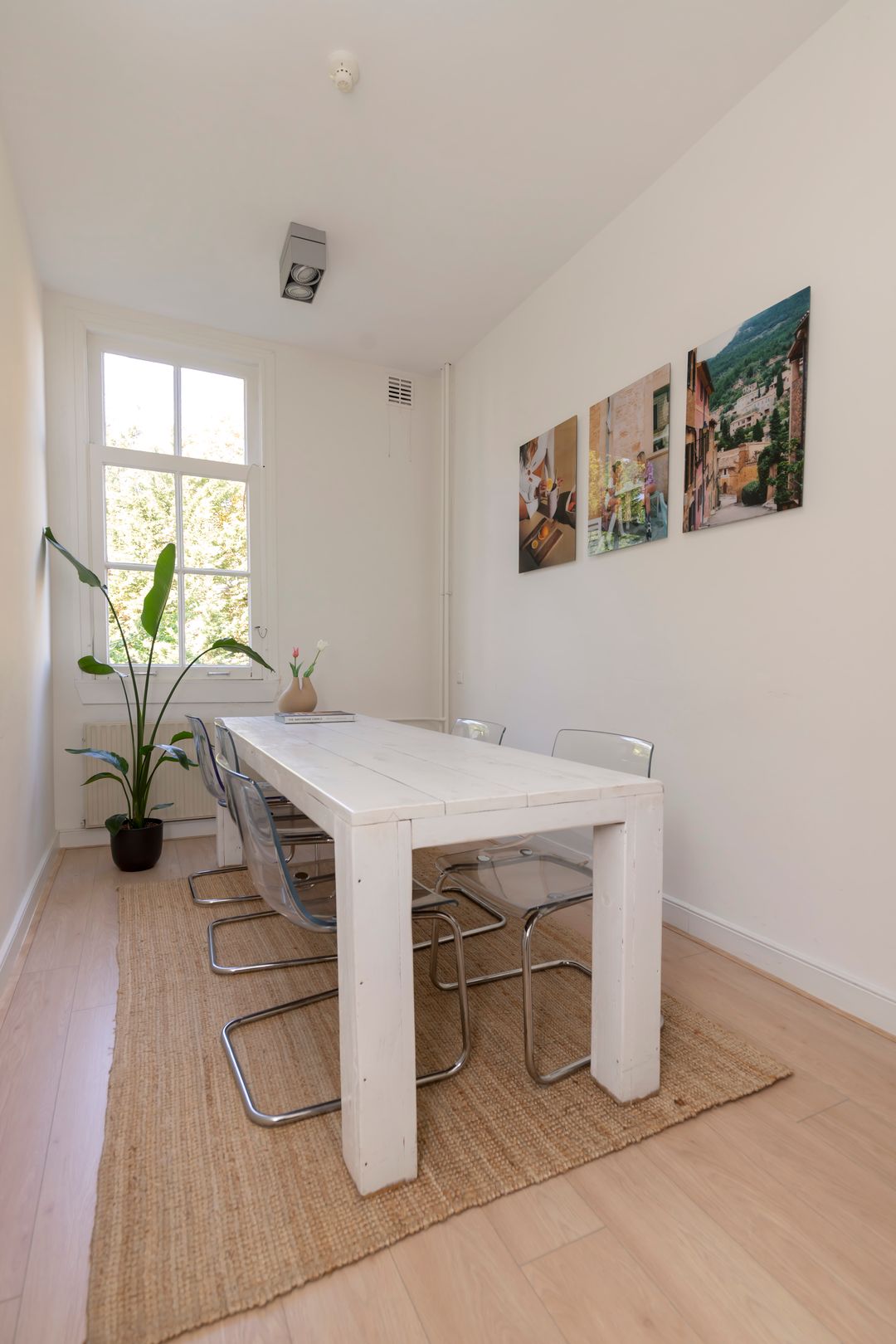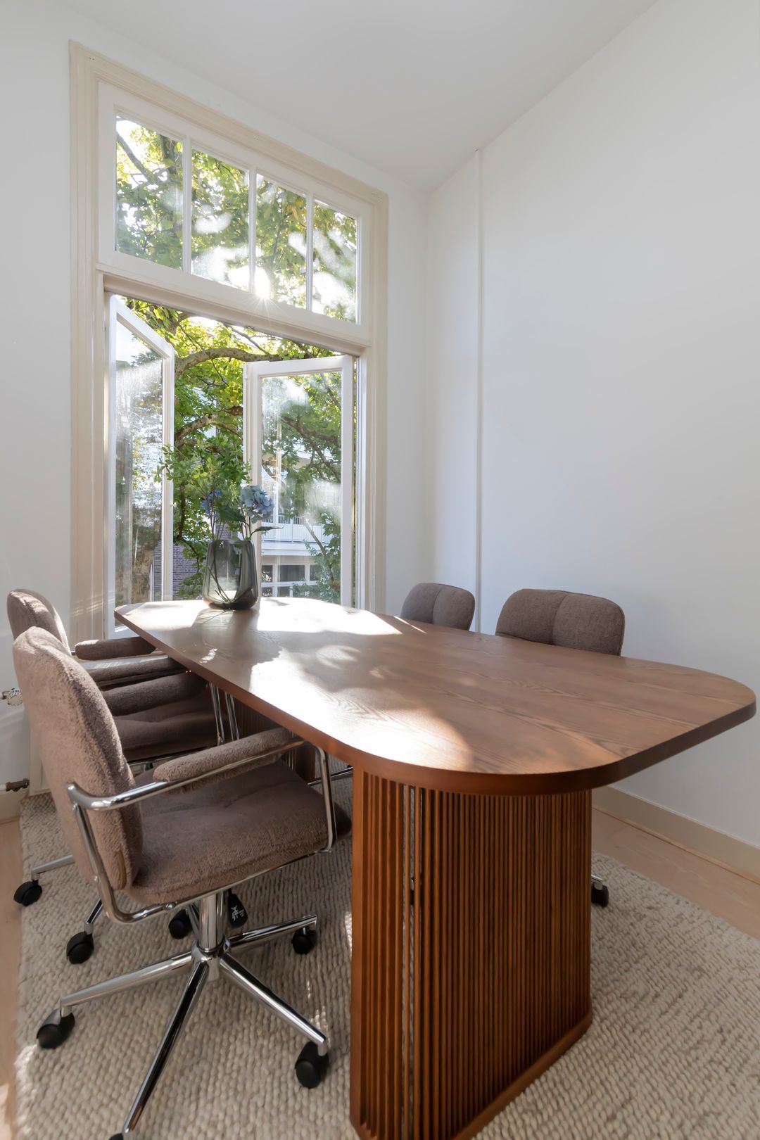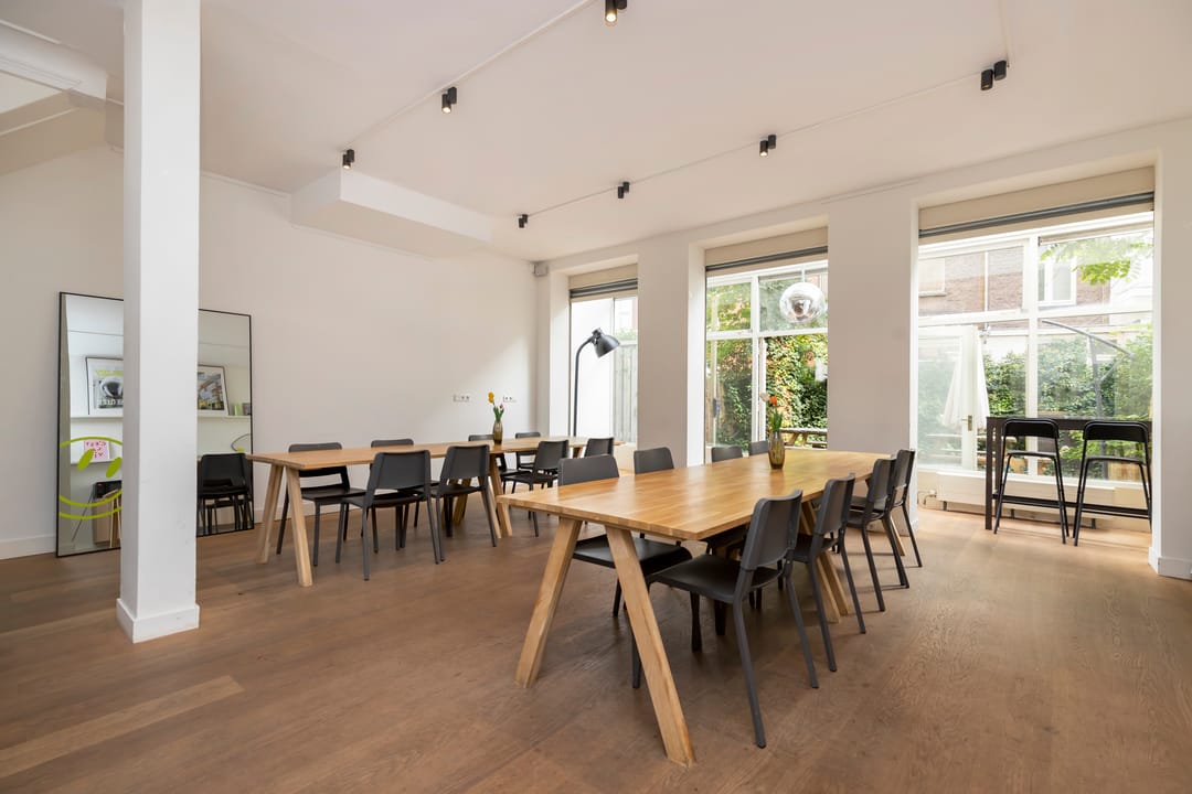 De kantoorruimte beschikt over een achtertuin die via de serre bereikbaar is en is ingericht met picknicktafels en een parasol. Daarnaast zijn er twee balkons aanwezig.