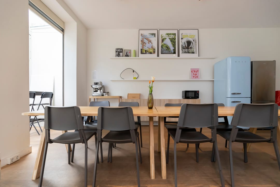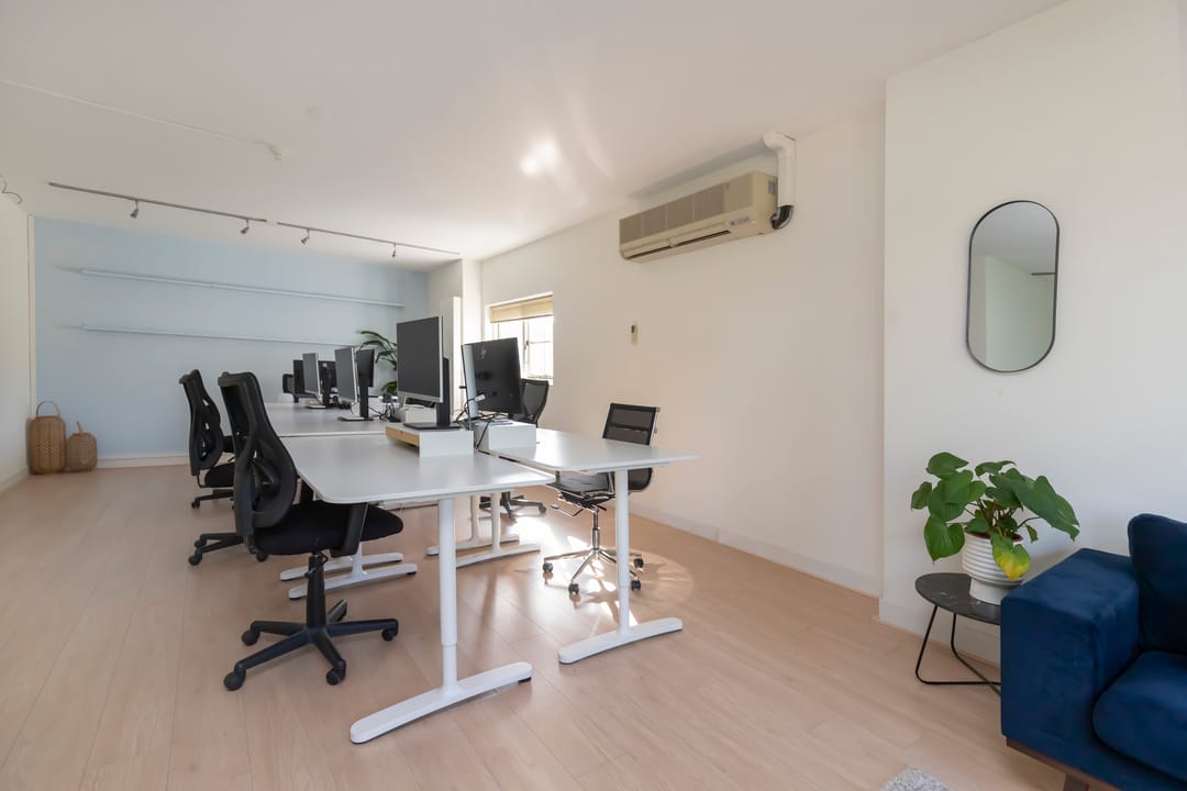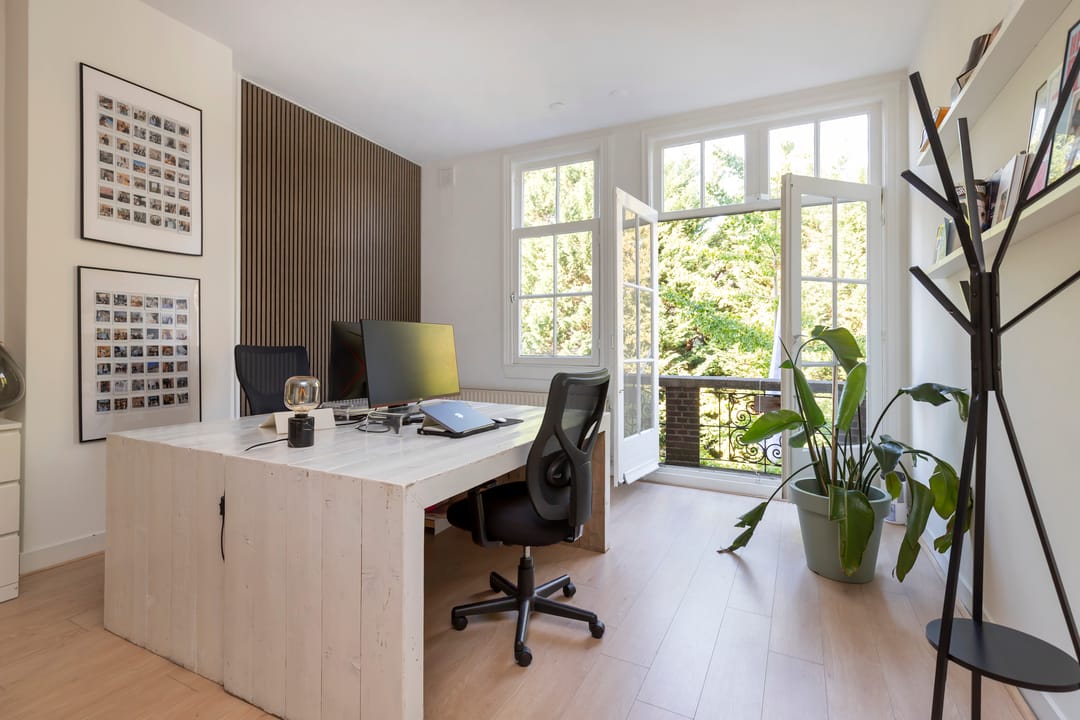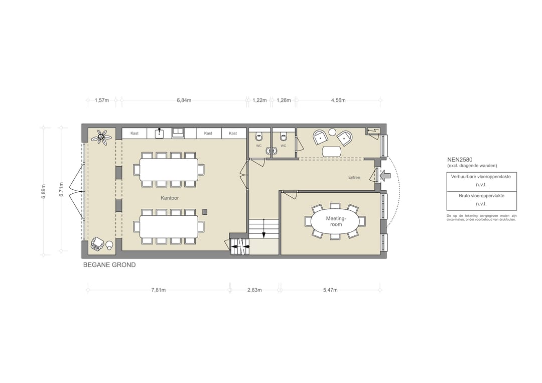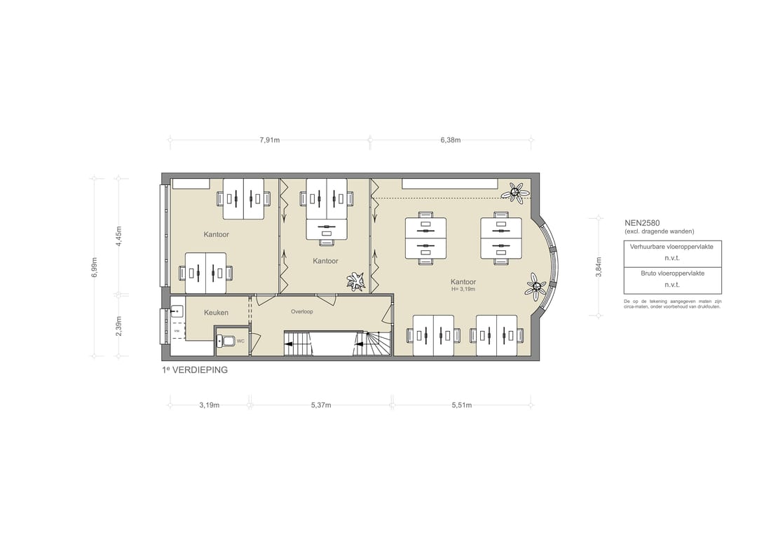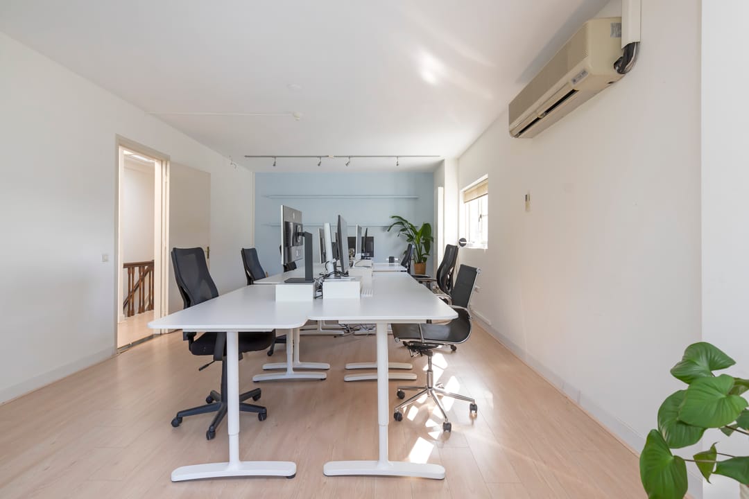De kantoorruimte beschikt over een achtertuin die via de serre bereikbaar is en is ingericht met picknicktafels en een parasol. Daarnaast zijn er twee balkons aanwezig.